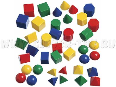 - Набор "Фигуры геометрические" - Набор из 40 геометрических фигур 4 цветов в 10 формах: сфера, полусфера, треугольник, прямоугольная призма, куб, шестиугольная призма, треугольная пирамида, пирамида, конус, цилиндр. Помогает освоить основы геометрии.