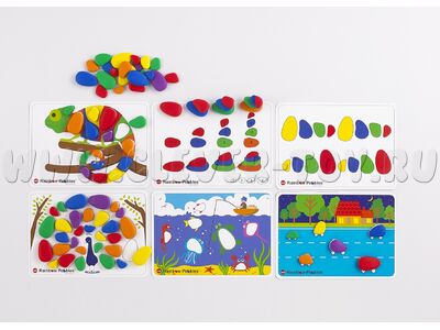 - Набор «Радужные камешки» - 48 камешков 4 размеров в 6 цветах, выполненных из высокопрочного, гибкого пластика, а также 12 плотных красочных двусторонних карточек размера А4 с вариантами заданий.