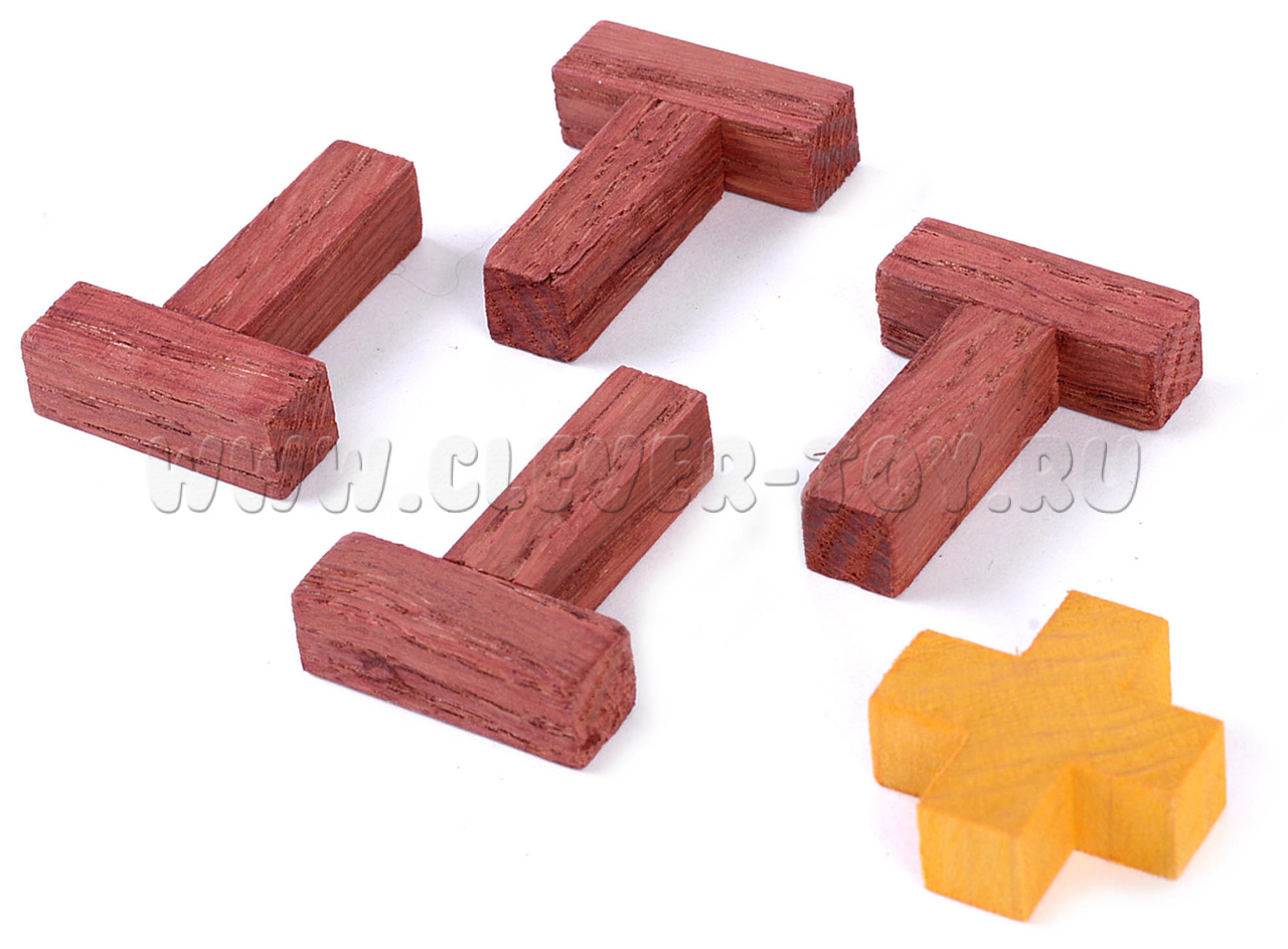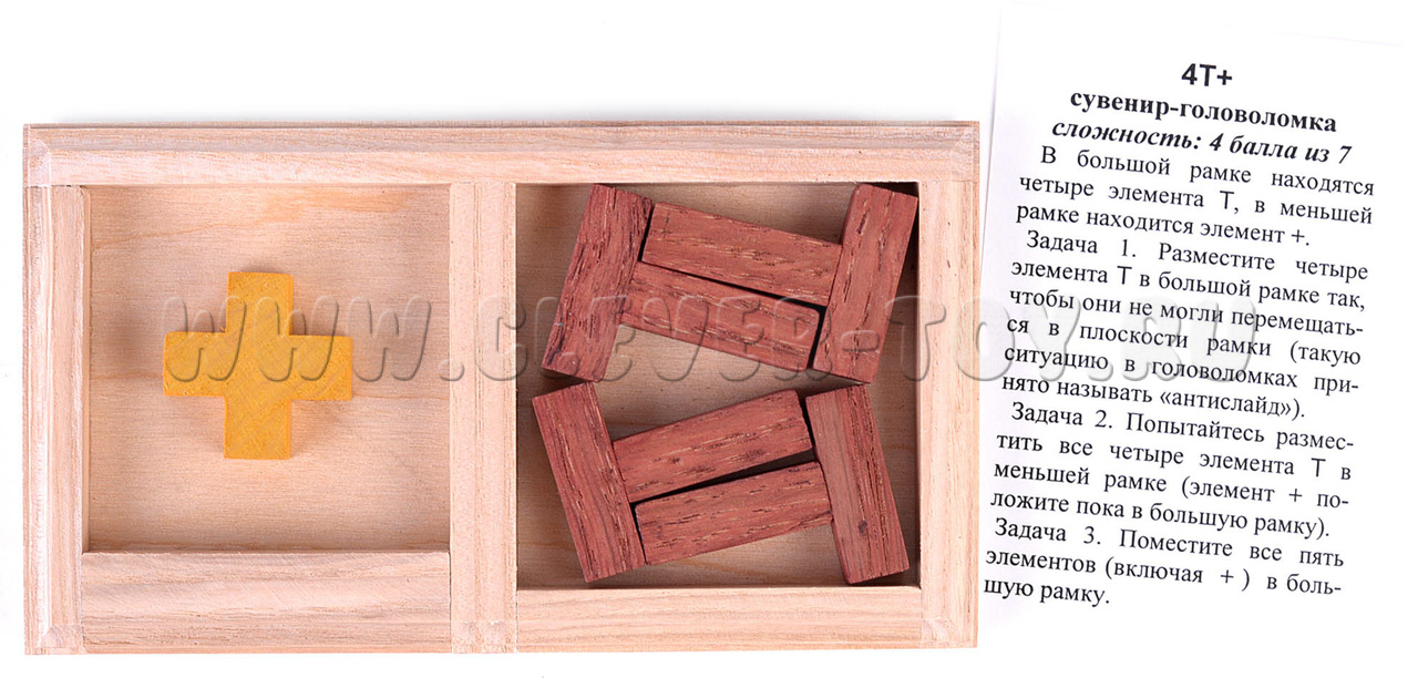 Головоломка "4Т+” имеет 3 задачи: сначала нужно расставить все четыре фигурки «Т» в большой рамке, затем – в малой. Затем нужно собрать фигурки «4 Т» и «плюс» в большую рамку. Несмотря на то, что игра может показаться легкой, она скрывает непростую головоломку, которая потребует от игрока смекалки и находчивости.