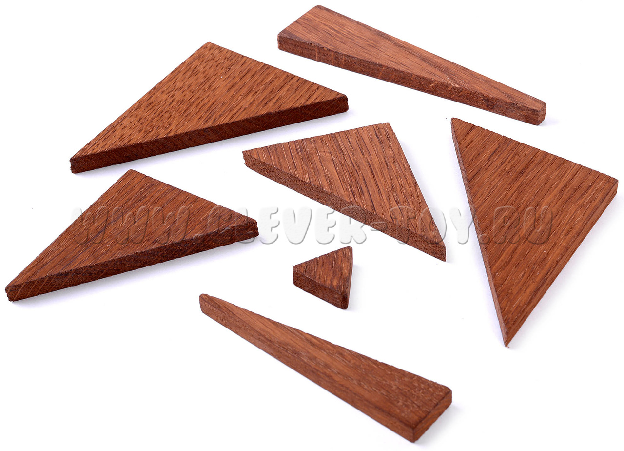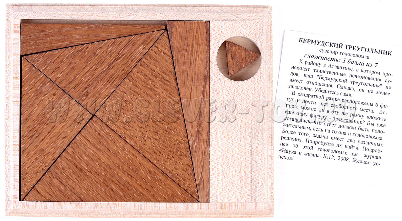 Головоломка "Бермудский треугольник" - это интригующая задача, состоящая из квадратной рамки и семи деревянных треугольников различной формы и размера. Цель головоломки - вложить один дополнительный треугольник в эту рамку, которая уже заполнена 6-ю треугольниками. Интересно, что существует два различных решения для этой головоломки.