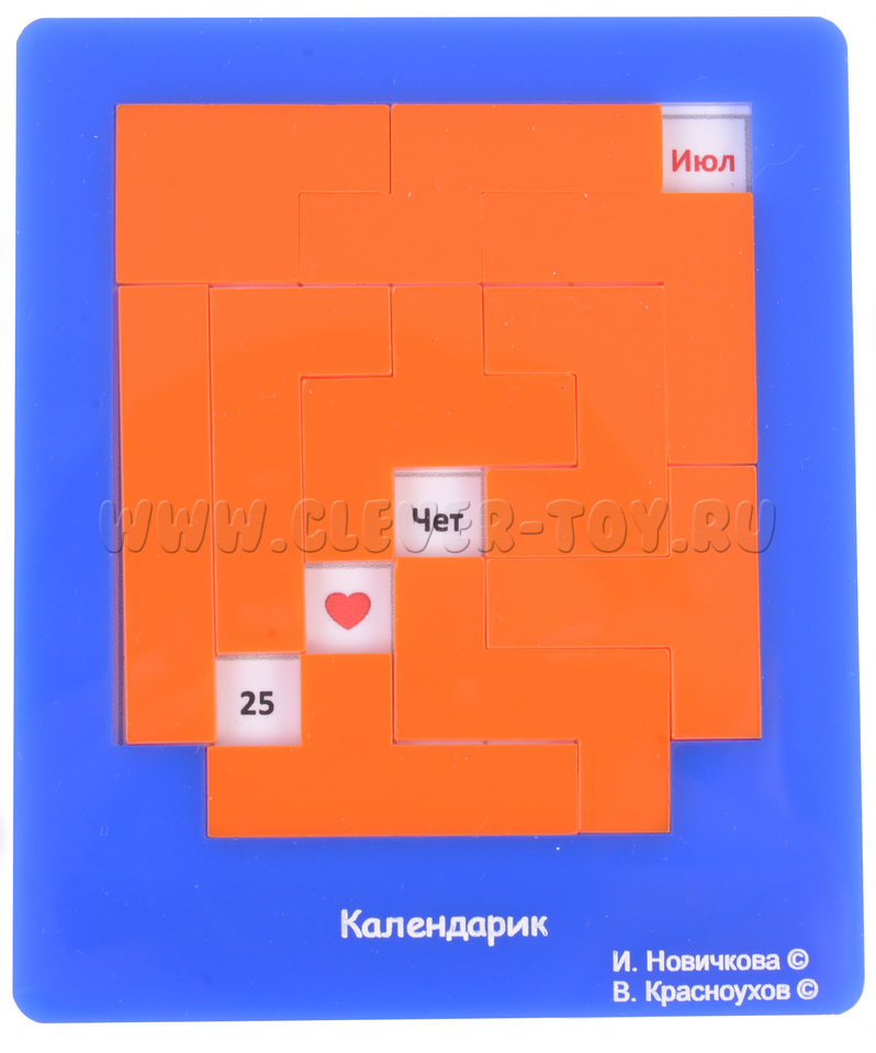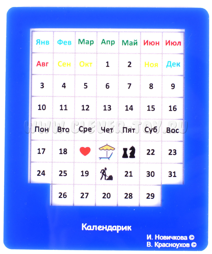 Задача. Уложите детали головоломки так, чтобы непокрытыми остались 4 окошка - одно с числом, одно с месяцем, одно - с днём недели и одно с планируемым родом занятий:"работа","спорт","встреча","отдых".