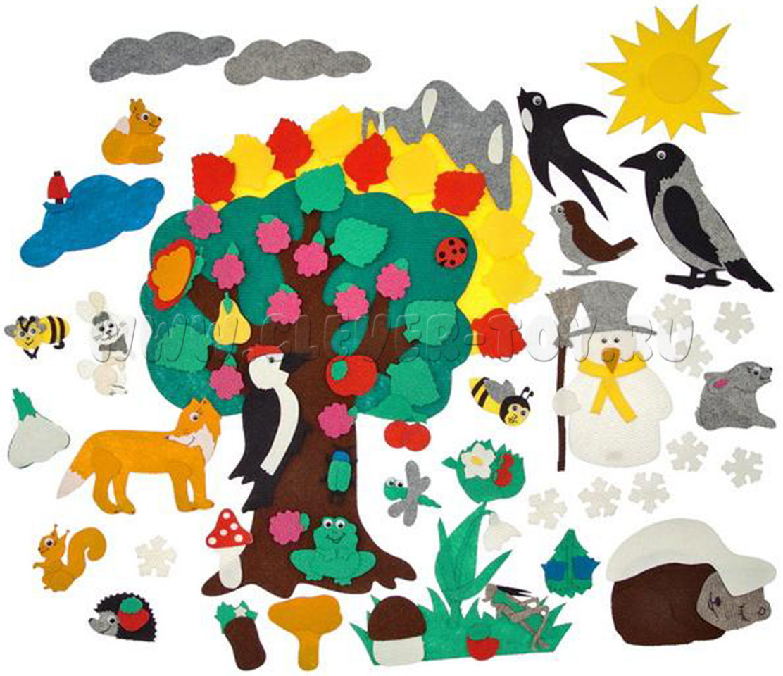 • растения – груша, яблоко, клубника, шиповник, крона жёлтая, крона зелёная, ствол дерева, листочки зелёные, красные, жёлтые, цветочки – 10 шт.;