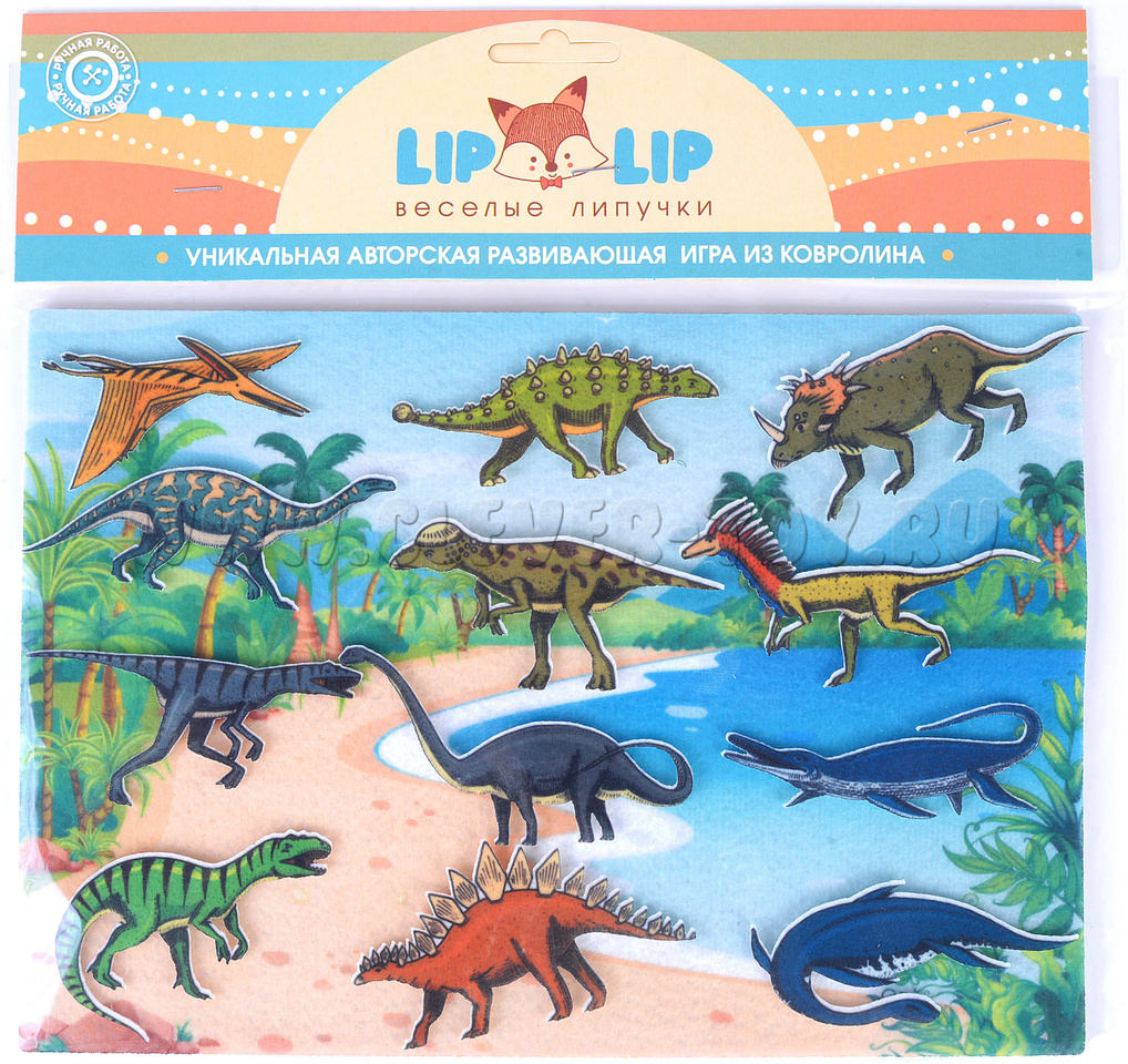 • 12 фетровых фигурок динозавров – мезозавр, птерозавр, велоцираптор, стегозавр, барозавр, анкилозавр, эласмозавр, тираннозавр, платеозавр, трицератопс, дейноних, пахицефалозавр.