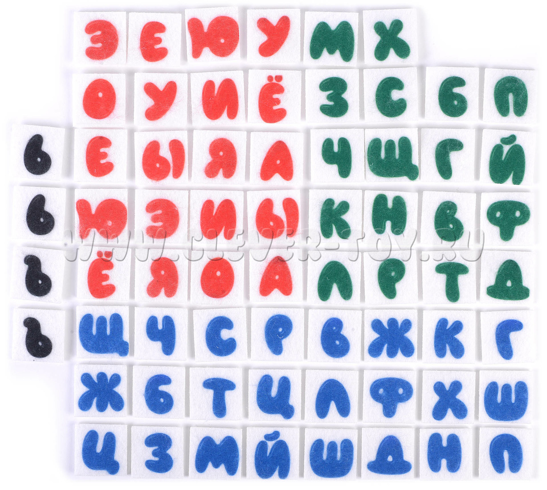 - 66 букв русского алфавита (2 набора гласных – красного цвета, 2 набора согласных – синего и зелёного цвета).