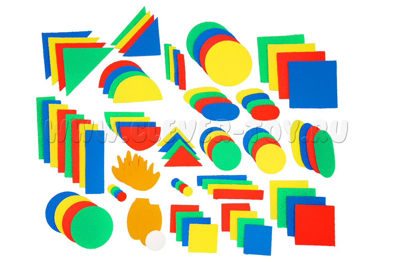 - треугольники большие, средние, маленькие 4-х цветов (синие, красные, зелёные, жёлтые) - 12 штук,