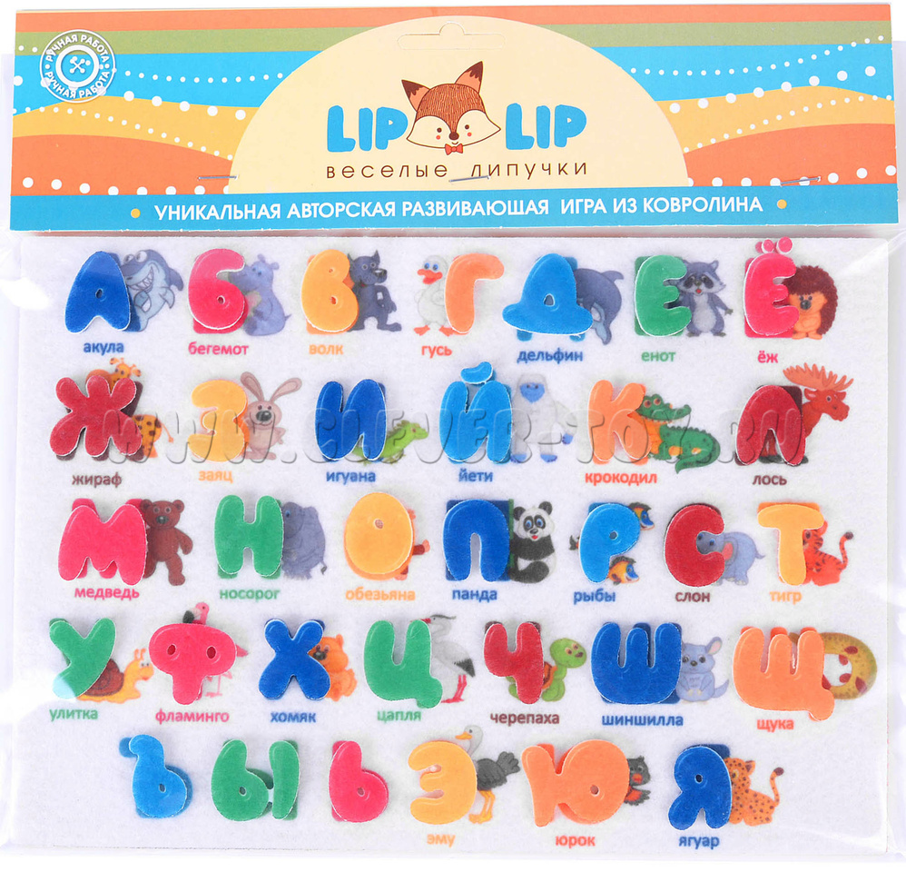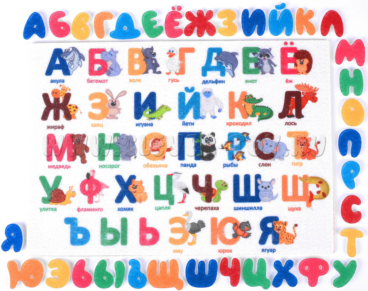 • 33 буквы на липучках синего, голубого, красного, зелёного, жёлтого и оранжевого цветов;