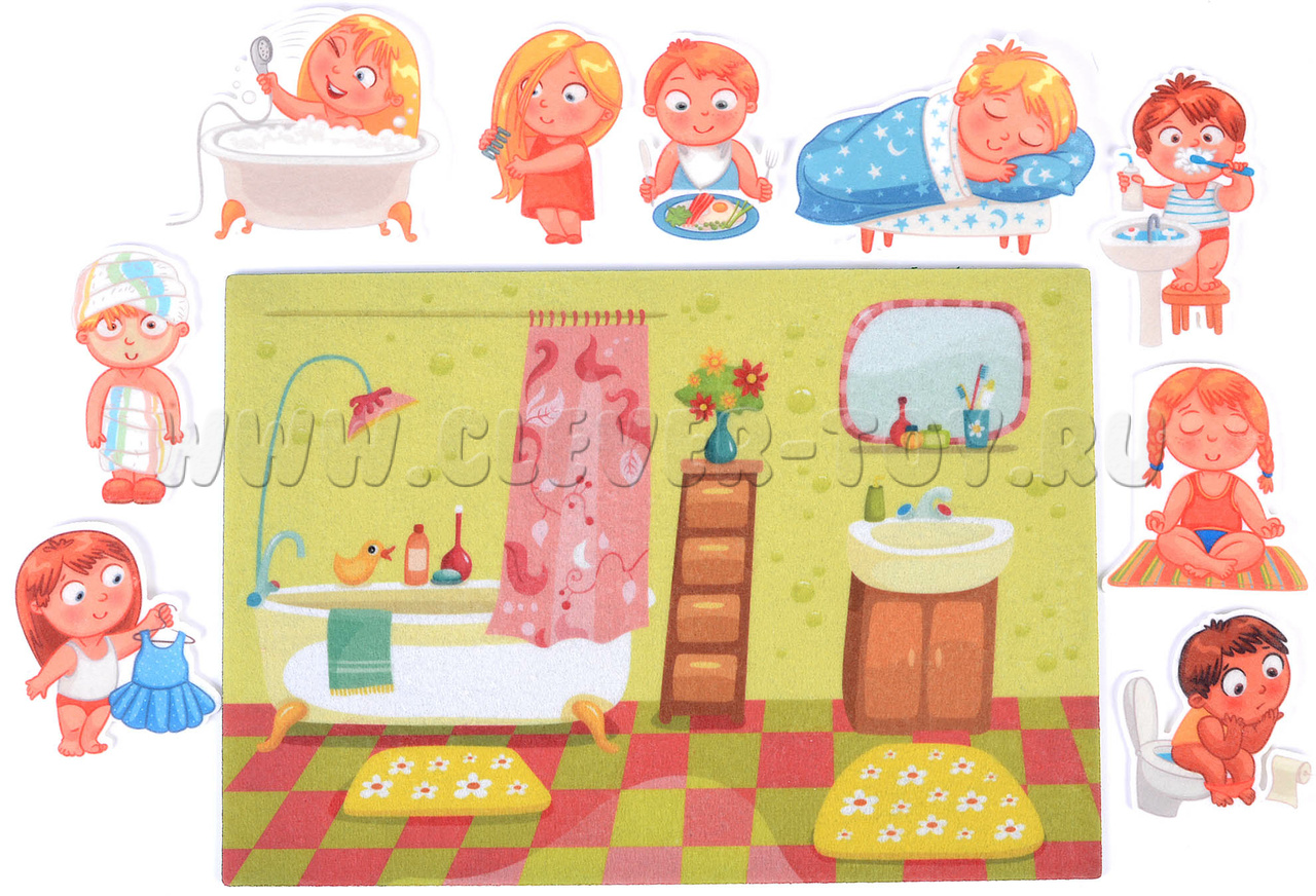 - 9 фигурок: ребёнок, сидящий на горшке, ребёнок, который чистит зубы, кушает, занимается йогой, расчёсывается, спит, одевается, ребёнка, принимающего ванную, ребёнка, закутанного в полотенце после купания;