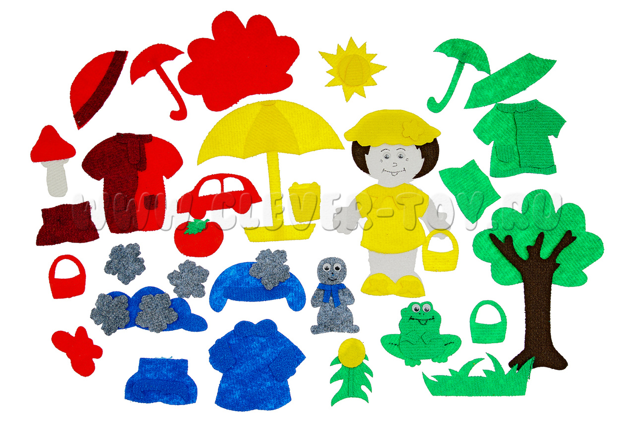 - одежда, аксессуары и атрибуты осени (красный): шапка, комбинезон, ботинки, крона дерева, машинка, бабочка, зонт, корзинка, гриб, яблоко;