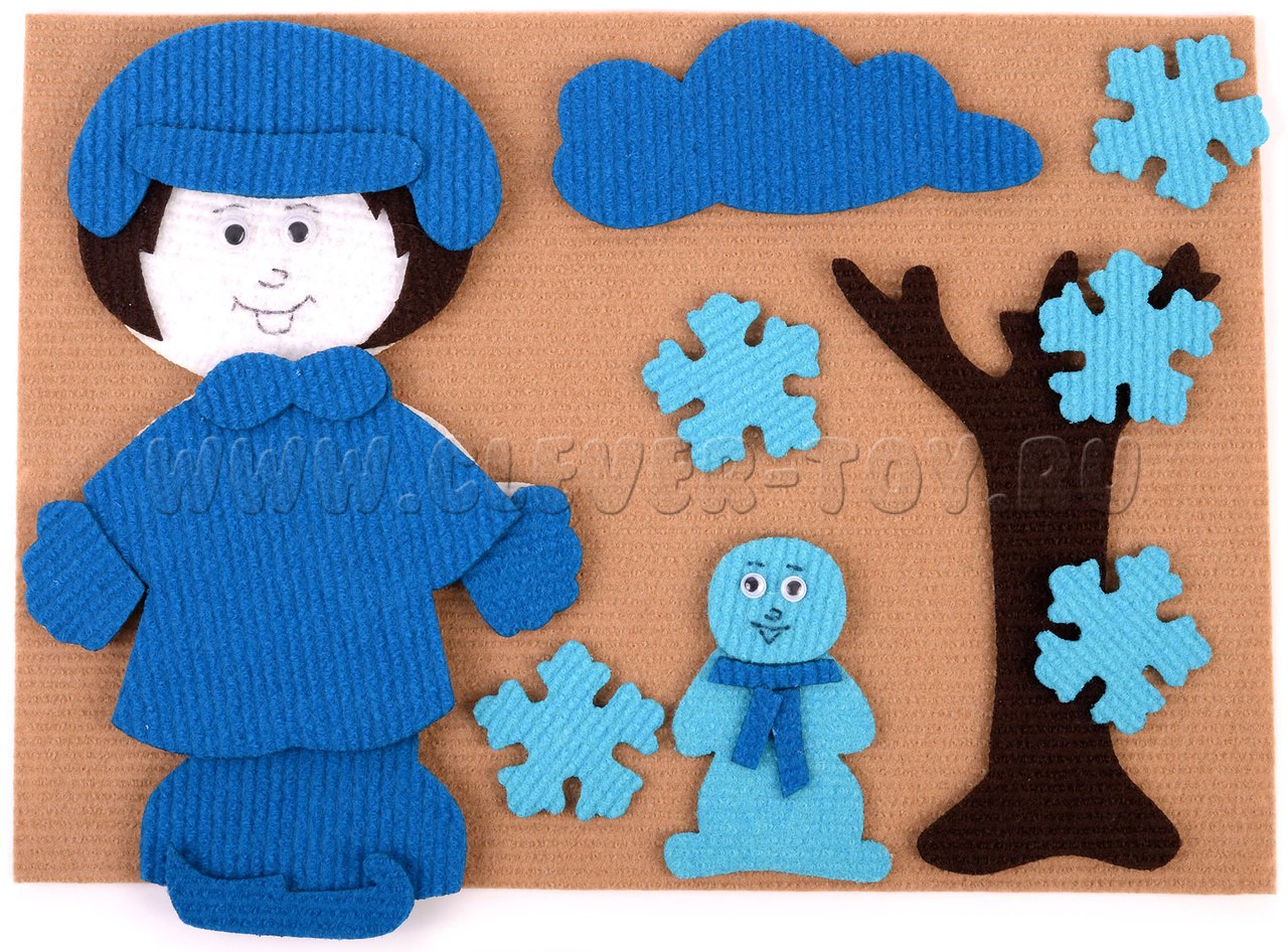• одежда, аксессуары и атрибуты зимы (синий): шапка, шуба, сапоги, перчатки, снежинки, снеговик, туча;