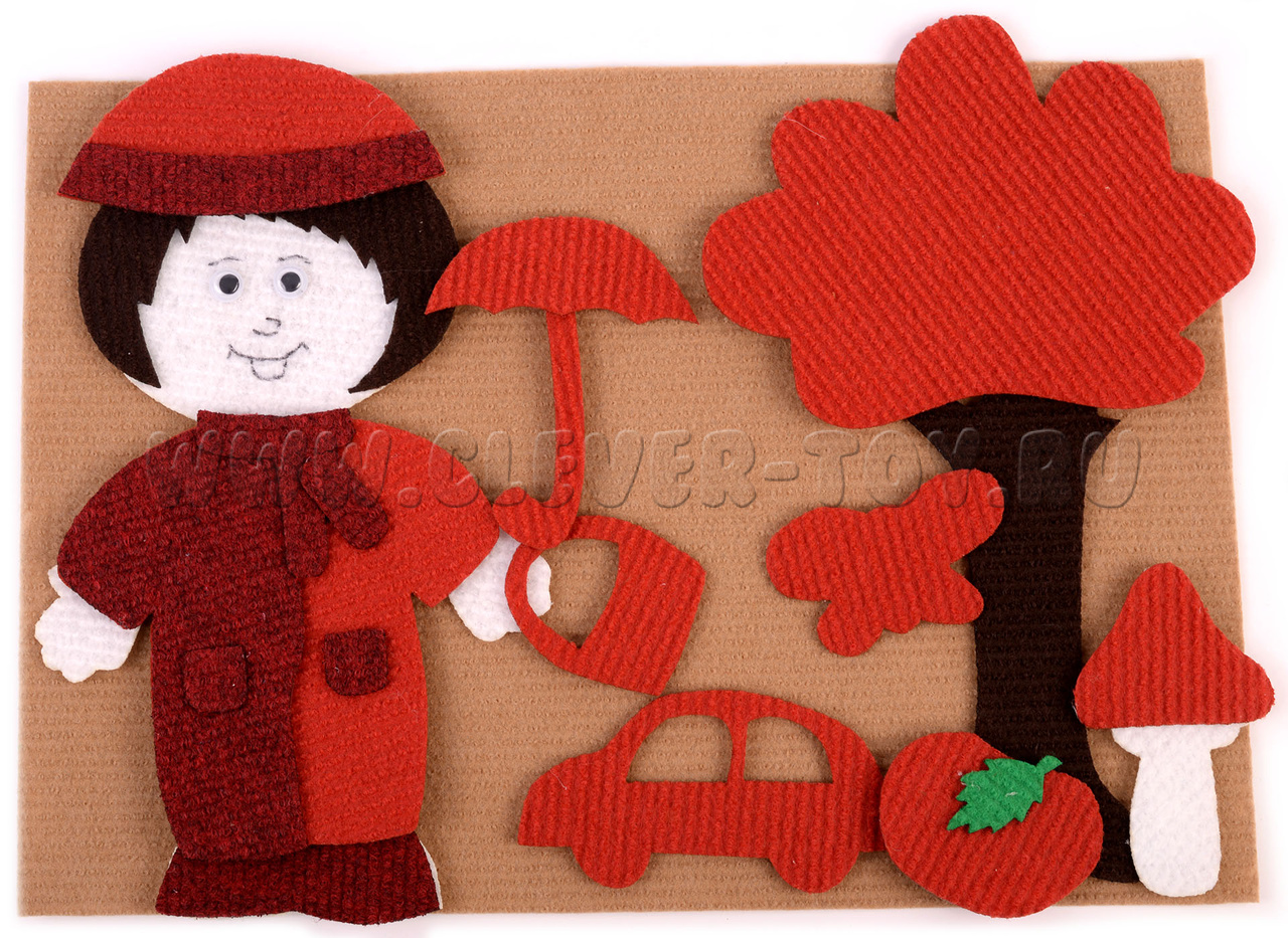 • одежда, аксессуары и атрибуты осени (красный): шапка, комбинезон, ботинки, крона дерева, машинка, бабочка, зонт, корзинка, гриб, яблоко;
