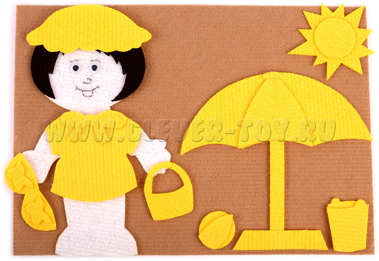 • одежда, аксессуары и атрибуты лета (жёлтый): платье, панамка, босоножки, зонт, корзинка, ведёрко, мяч, солнце;
