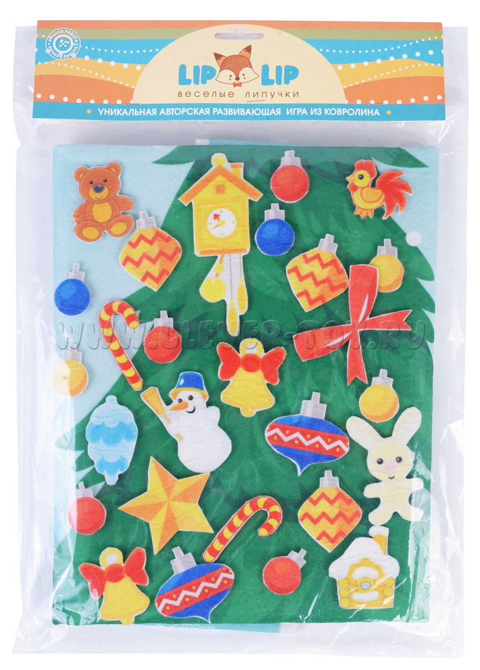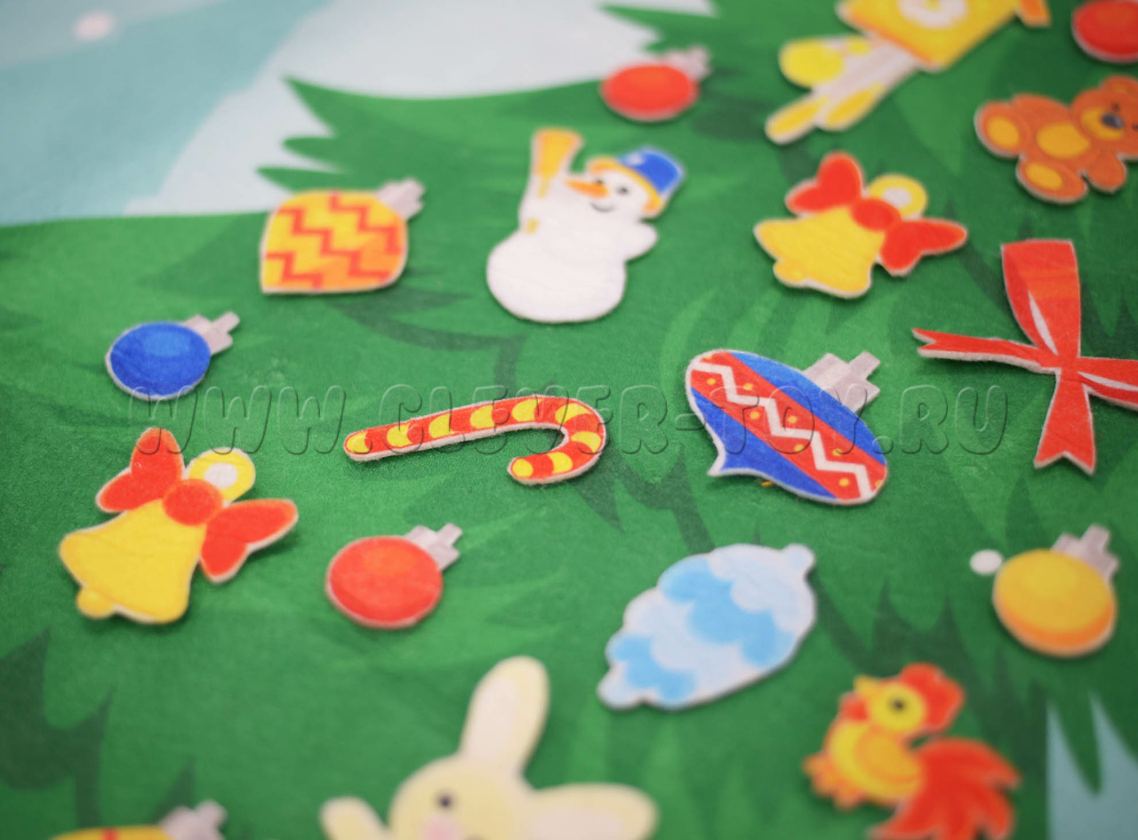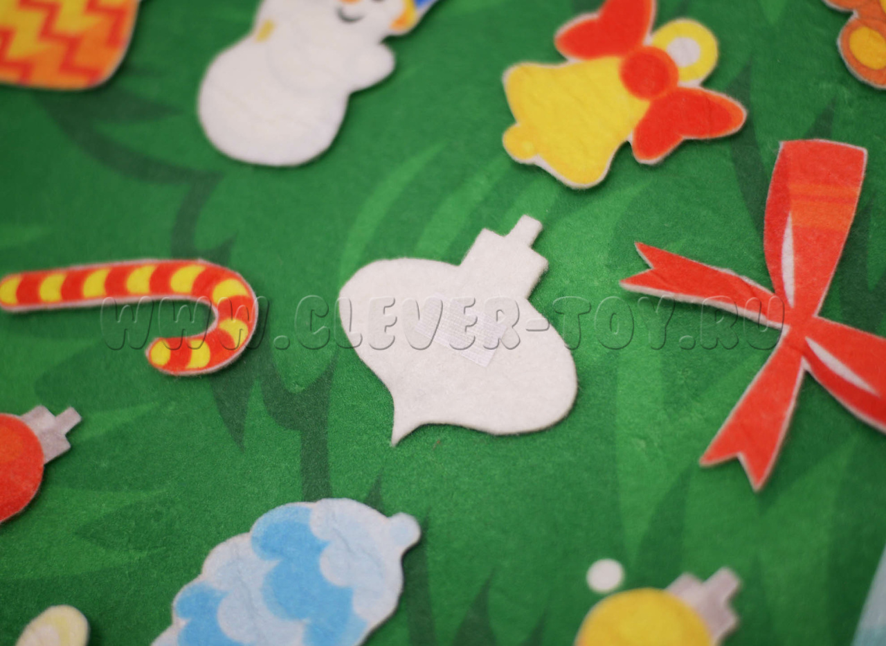 - игровые элементы из фетра – ёлочные игрушки (звёздочки, шишечки, зайчики, шарики, колокольчики, часики, бантики, леденцы).
