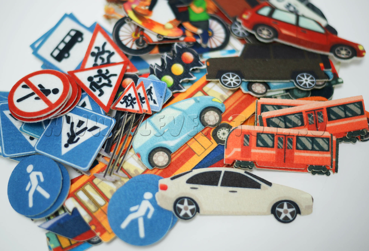 - 13 фигурок машинок и общественного транспорта: легковые и грузовые автомобили, поезд, троллейбус, полицейская машина, пожарная машина, скорая помощь, автобус; пароход и катер; более 20-ти дорожных знаков; 6 светофоров, 8 фигурок детей;