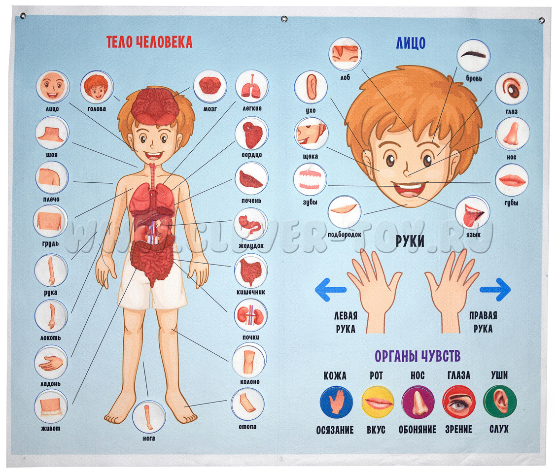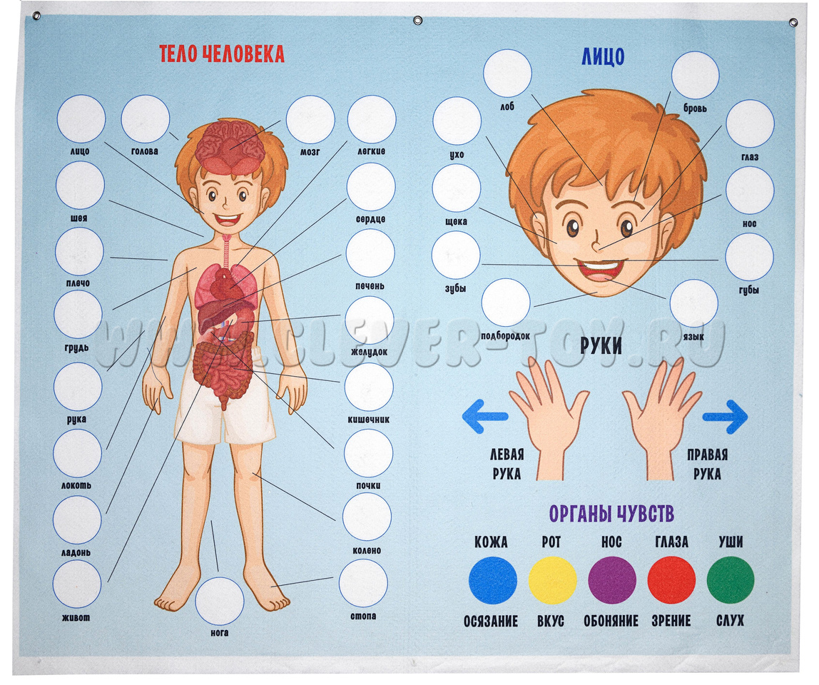 5. Весёлый плакат: предложите детям самостоятельно заполнить плакат, приклеивая органы на соответствующие места. После этого можно обыграть каждый орган, имитируя его функции.