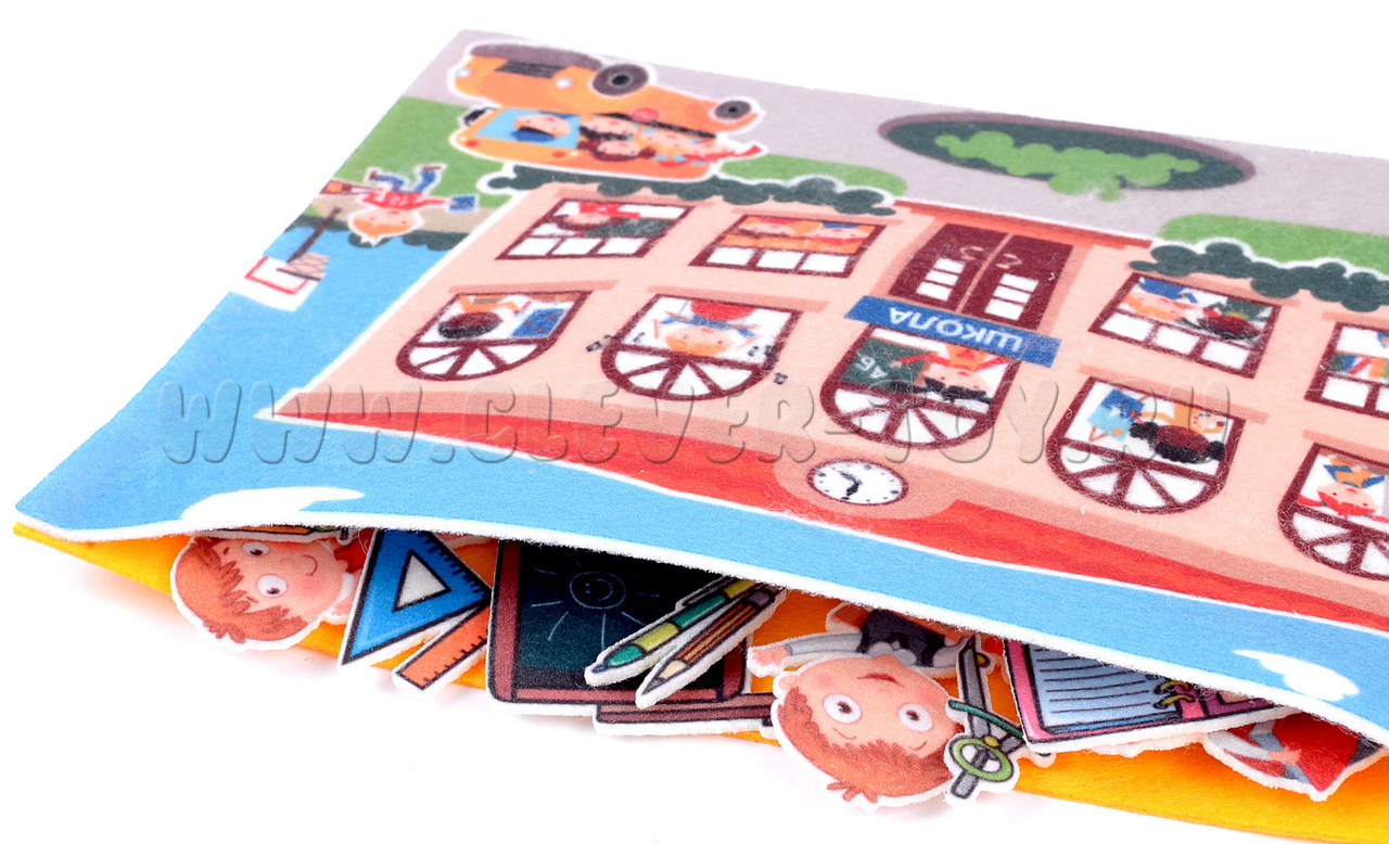 • тематическое игровое поле с детально прорисованной картинкой, изображающей обстановку школы, выполнено в форме конверта, в котором удобно хранить игровые элементы;