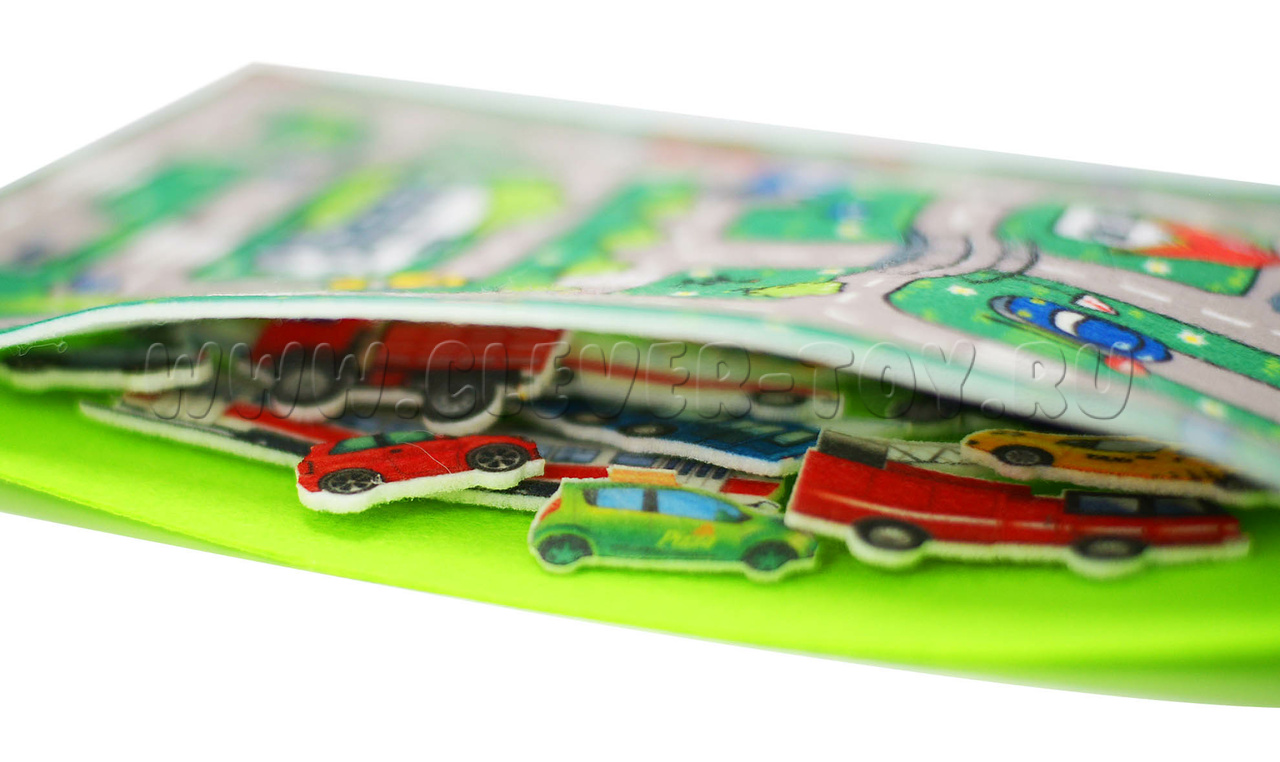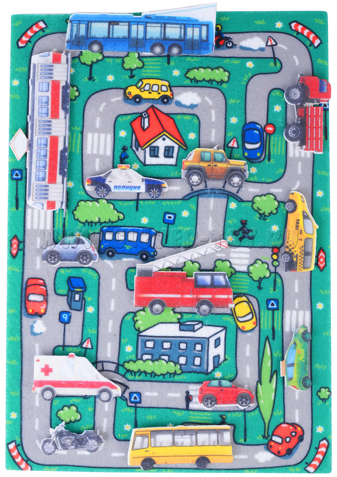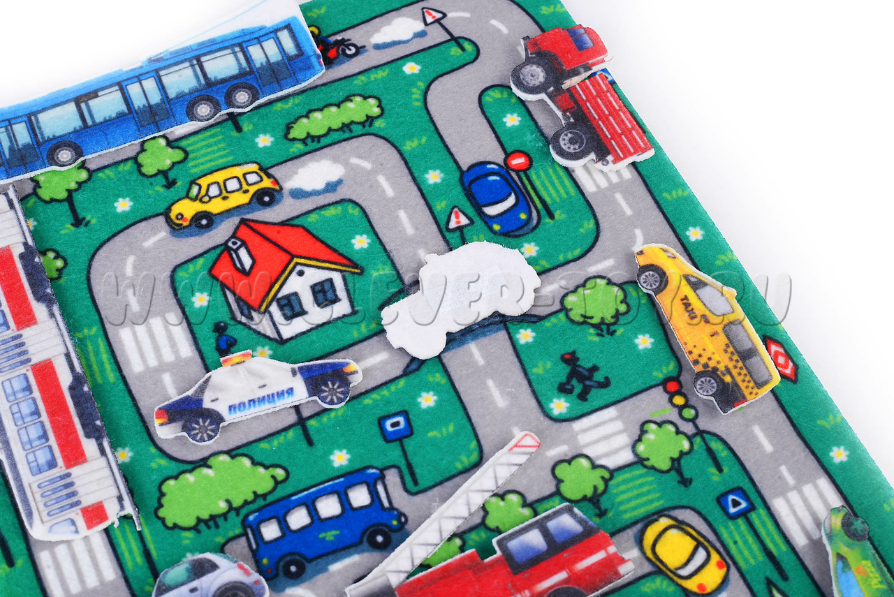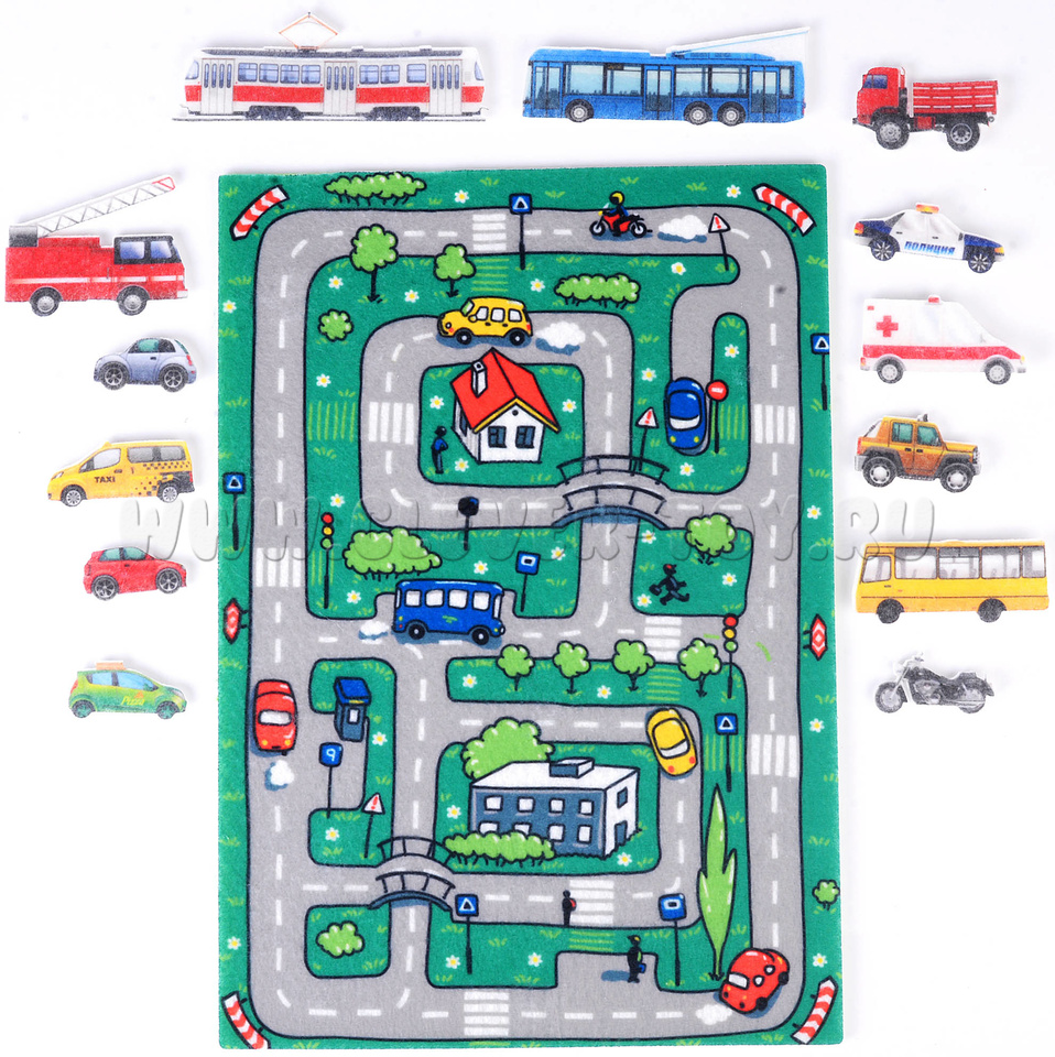 Благодаря игровому полю в виде городских улиц и множеству реалистичных фетровых машинок, взрослые и дети могут разыгрывать различные ситуации, придумывать интересные сюжетные игры, придумывать и разыгрывать истории по собственным сценариям.