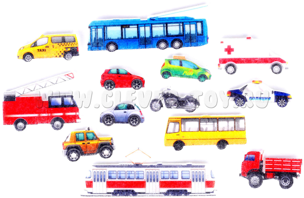 • 13 фигурок машинок и общественного транспорта: легковые и грузовые автомобили, трамвай, троллейбус, полицейская машина, пожарная машина, скорая помощь, автобус, такси;
