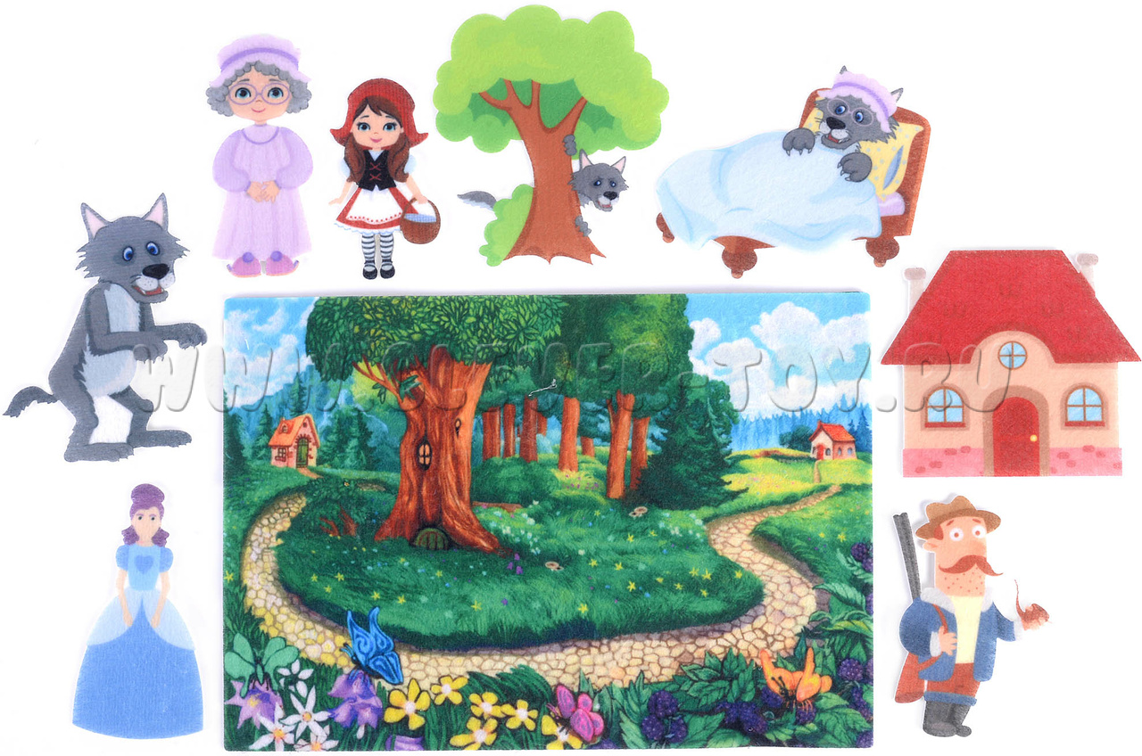 - Фигурки персонажей: Красной Шапочки, бабушки, волка в двух образах, мамы и охотника (6 шт.).