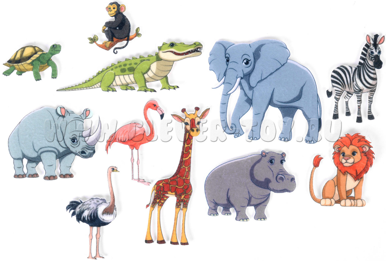 • Фигурки: слон, лев, зебра, носорог, тигр, бегемот, жираф, фламинго, тукан, страус, черепаха, крокодил, змея и обезьяна (14 шт.).