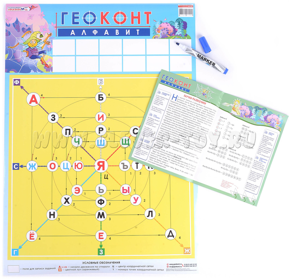 Игровое поле «Геоконт Алфавит» состоит из координатной сетки и 33-х точек на ней, каждая из которых связана с определённой буквой алфавита. Буквы расположены по спирали и соединены направляющими стрелками, облегчающими усвоение алфавитного порядка. Для удобства и интеграции в технологию «Сказочные лабиринты игры» игровое поле может быть условно разделено секторами и связано с образами «ЛеВ» (левый верхний угол), «ПаВлин» (правый нижний угол), «ПоНи» (правый нижний угол) и «ЛаНь» (левый нижний угол).