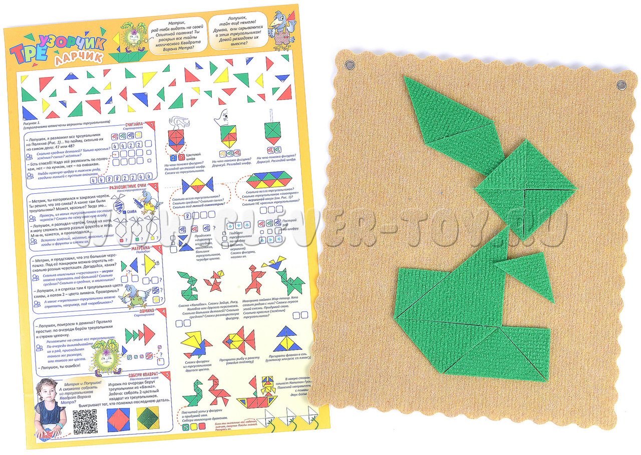Состав игры: Треугольники 3-х размеров - 48 штук (красные- 16 шт., зелёные - 16 шт., синие - 8 шт., жёлтые - 8 шт.) Подложка (ковролин 29,7 х 35 см.) с двумя люверсами по верхним углам.