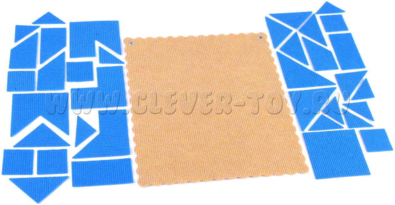 - 36 элементов из ковролина (многоугольник 1 – 1 шт., многоугольник 2 – 1 шт., многоугольник 3 – 1 шт., многоугольник 4 – 1 шт., треугольник маленький – 10 шт., треугольник средний – 7 шт., треугольник большой – 2 шт., квадрат большой – 1 шт., прямоугольник – 2 шт., трапеция 1 - 3 шт., трапеция 2 – 1 шт., квадрат маленький – 6 шт.;