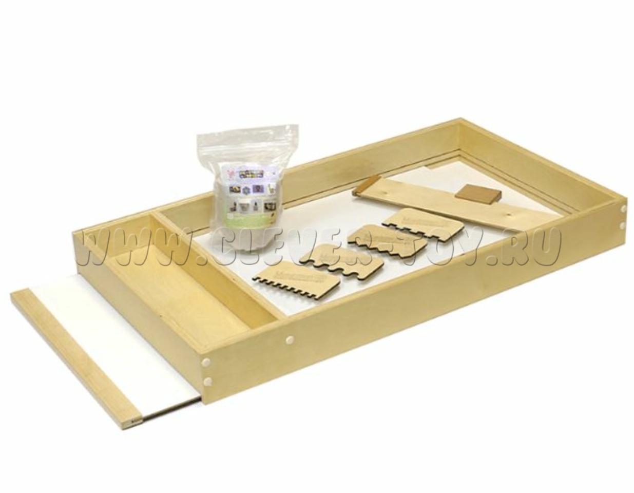 Большой деревянный ящик с прозрачным выдвижным дном. Прозрачное дно позволяет менять фон. Рисуем на песке или манке, используем при этом предметы, оставляющие следы.