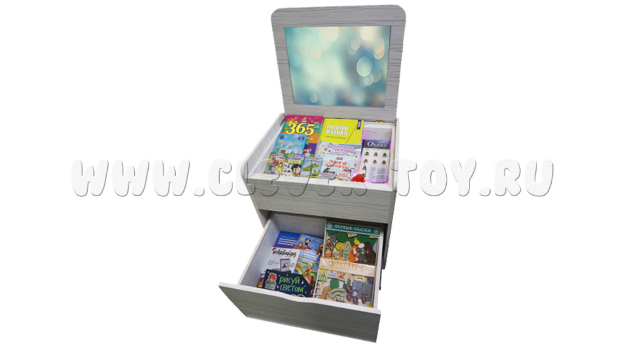 - встроенный ящик для хранения материалов и защитная крышка-столешница со встроенным акриловым зеркалом.