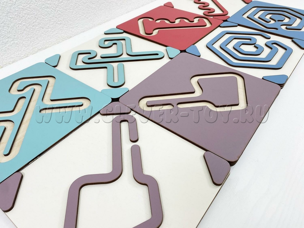 Два лабиринта с изображениями, расположенными симметрично, вставляются в пазы, и ребёнок проходит их с помощью специальных пальчиковых фишек.