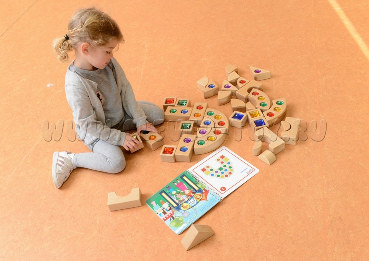 Игра "Набор сокровищ" включает 40 деревянных блоков из бука с яркими акриловыми вставками, похожими на драгоценные камни.