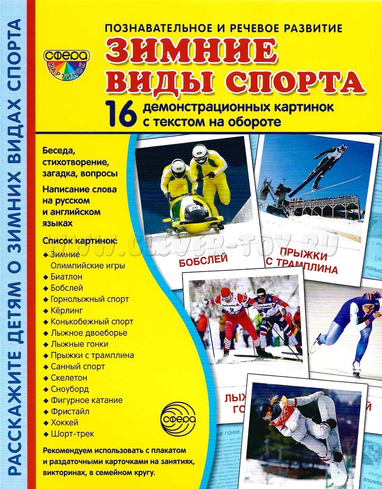 На лицевой стороне каждой карточки дается цветное изображение зимнего вида спорта, на обратной - подробное описание, из которого дети узнают много интересного и даже поучительного! Для лучшего закрепления материала представлены оригинальные