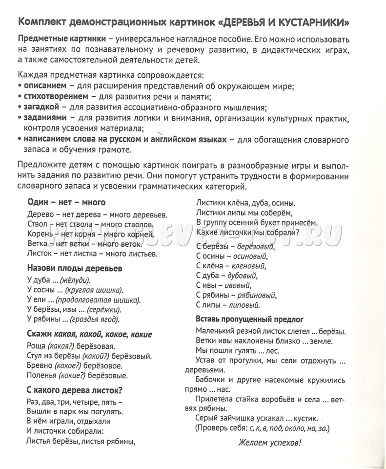 Состав комплекта (16 карточек): Берёза, Бузина, Вяз, Дуб, Ель, Ива плакучая, Каштан конский, Клён, Липа, Ольха, Осина, Сирень, Сосна, Тополь, Черёмуха, Ясень.
