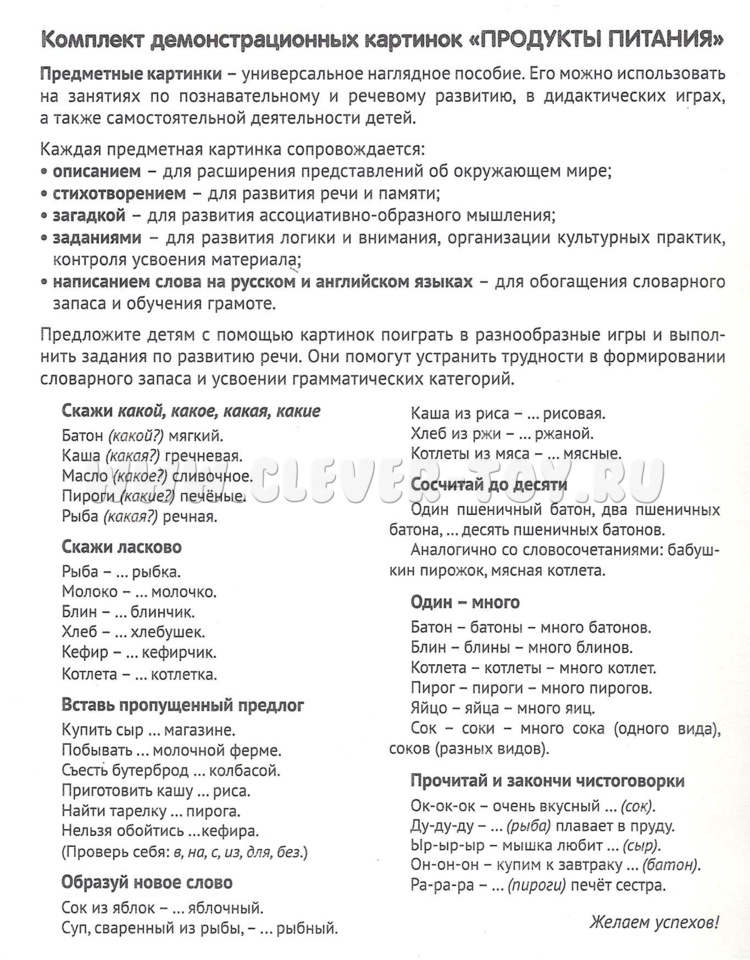 Набор карточек "Продукты питания" состоит из бесед, стихотворений, загадок и вопросов по теме. Комплект включает 16 цветных демонстрационных картинок с текстом на обороте, названия тем имеют перевод на английский язык.