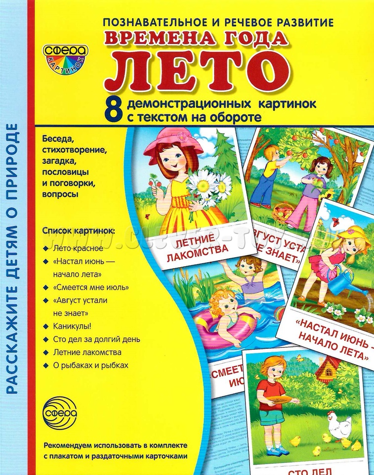 Набор демонстрационных картинок Времена года. Лето. Предметные картинки - универсальное наглядное пособие. Его можно использовать на занятиях по познавательному и речевому развитию, в дидакти-ческих играх, а также самостоятельной деятельности детей.