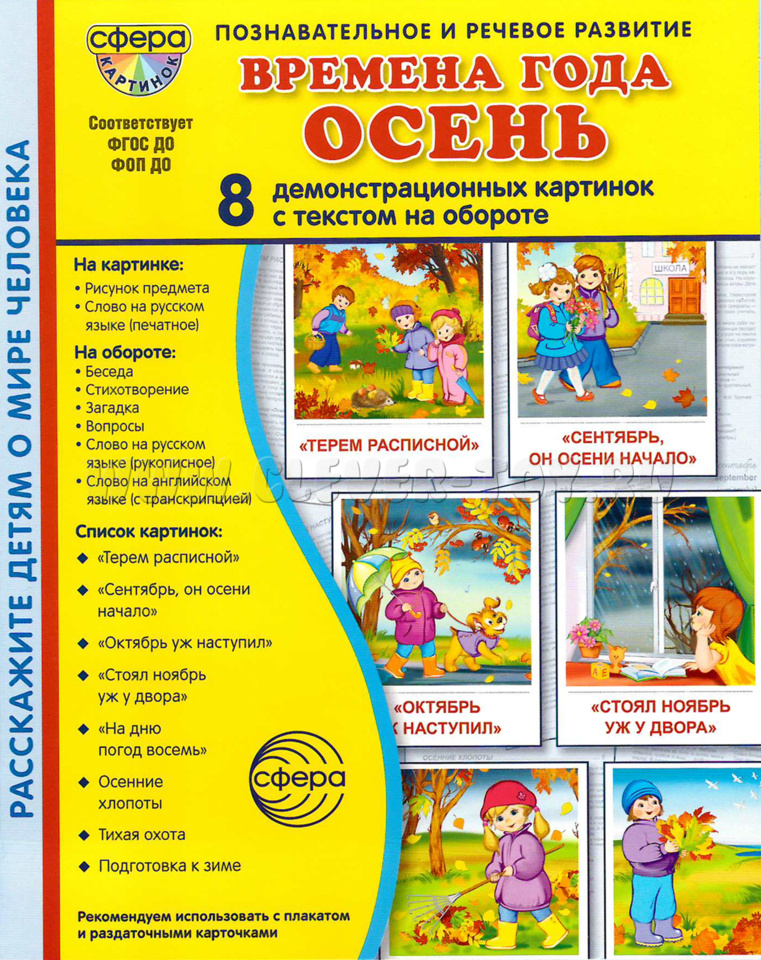 Набор демонстрационных картинок Времена года. Осень. Предметные картинки - универсальное наглядное пособие. Его можно использовать на занятиях по познавательному и речевому развитию, в дидактических играх, а также самостоятельной деятельности детей.