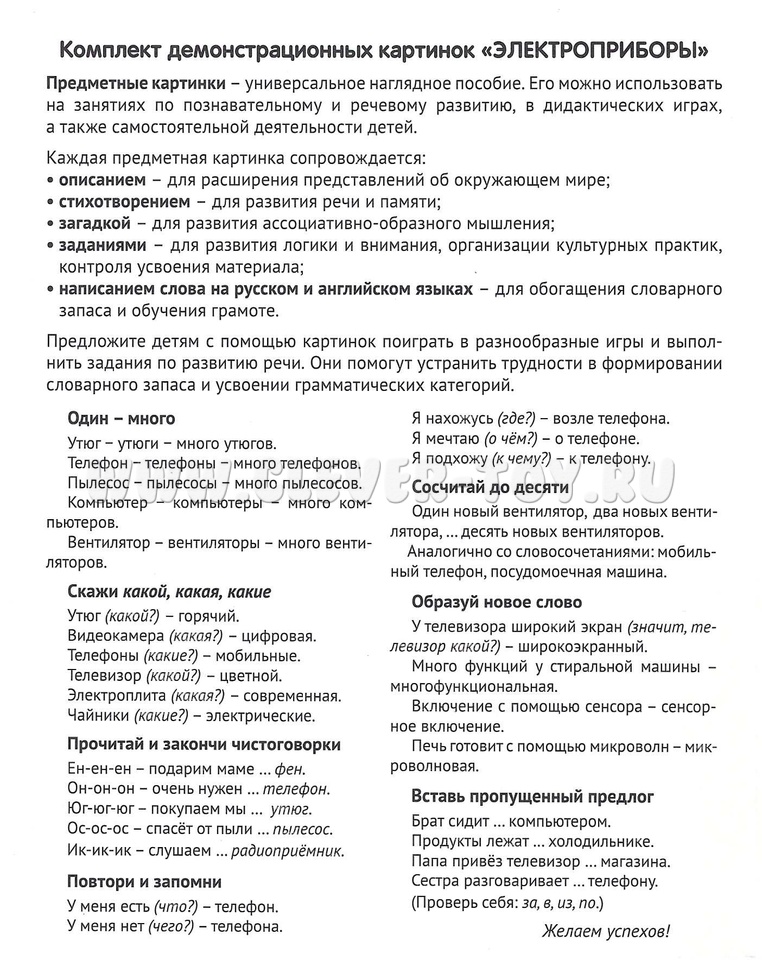 Комплект "Электроприборы" состоит из 16 цветных демонстрационных карточек (картинок) и адресован детям и их родителям. Откройте удивительный мир электроприборов вместе с нашими демонстрационными карточками для детей!