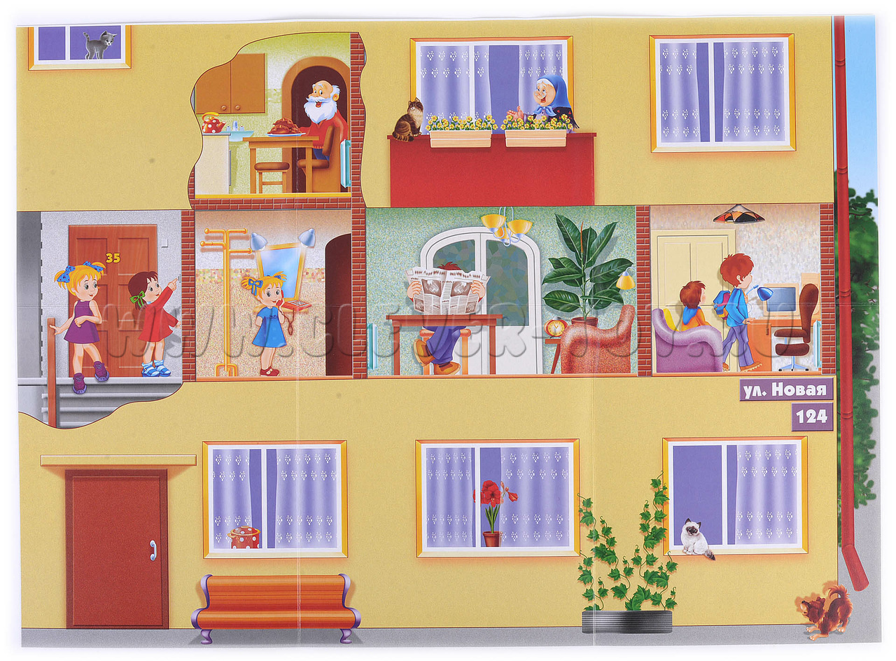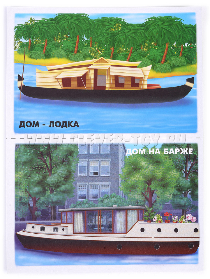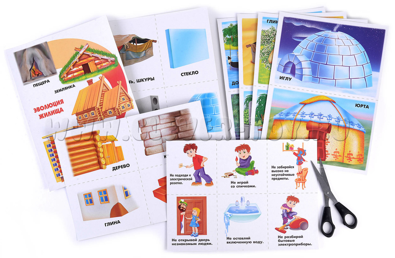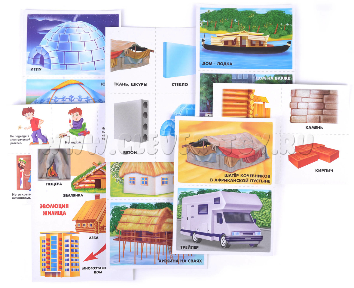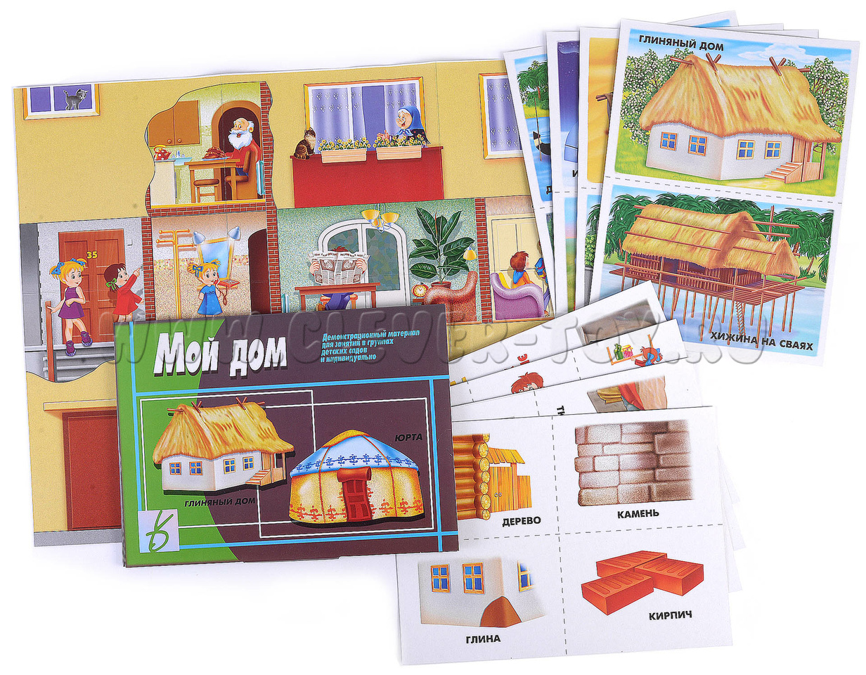 Демонстрационный материал Мой Дом. С помощью этого материала ребенок узнает историю жилища человека, почему в процессе жизни человек совершенствовал свой дом. Также ребенку будет интересно узнать, почему в соответствии с климатом люди строят разные дома, как они называются и из каких материалов строятся. На изображенном большом доме Вы сможете объяснить понятие адреса, из чего состоит дом, название комнат, как обогревается и освещается дом. Также Вы можете объяснить детям правила поведения дома, если ребенок остался один. Перед началом игры необходимо разрезать карты по пунктирным линиям.
