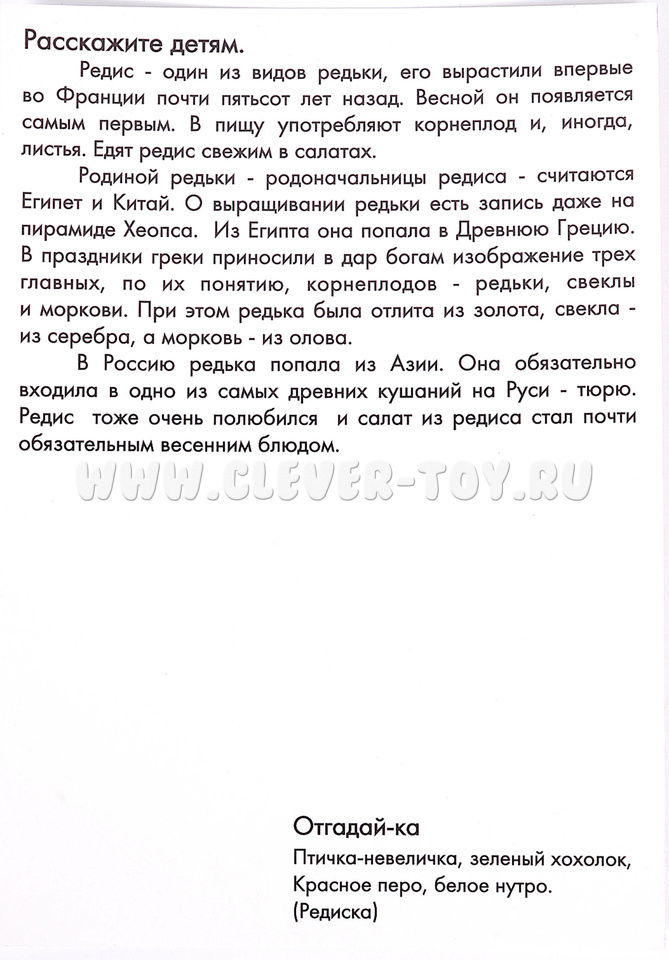 Карточки выполнены из плотного матового картона. С одной стороны нанесены рисунки, с овощами, а с другой стороны очень познавательная и интересная информация, включающая загадки. Игра состоит из 16 карточек и коробки. На обратной стороне коробки написаны примеры игр с детьми. Задача этой серии расширить кругозор, словарный запас и логическое мышление.