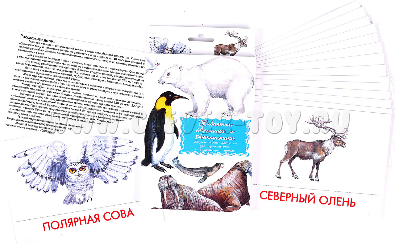 В набор водит 16 карточек с изображениями животных, обитающих в Арктике и Антарктике: