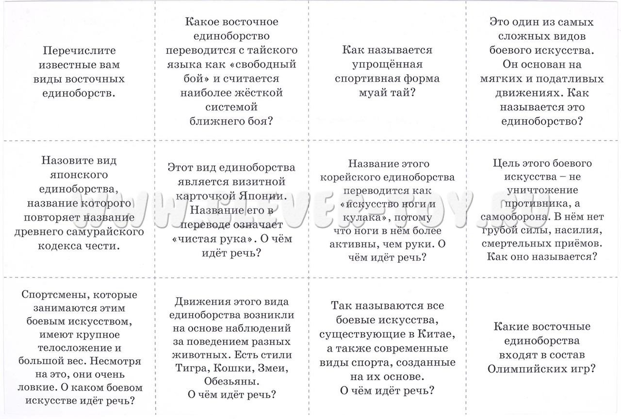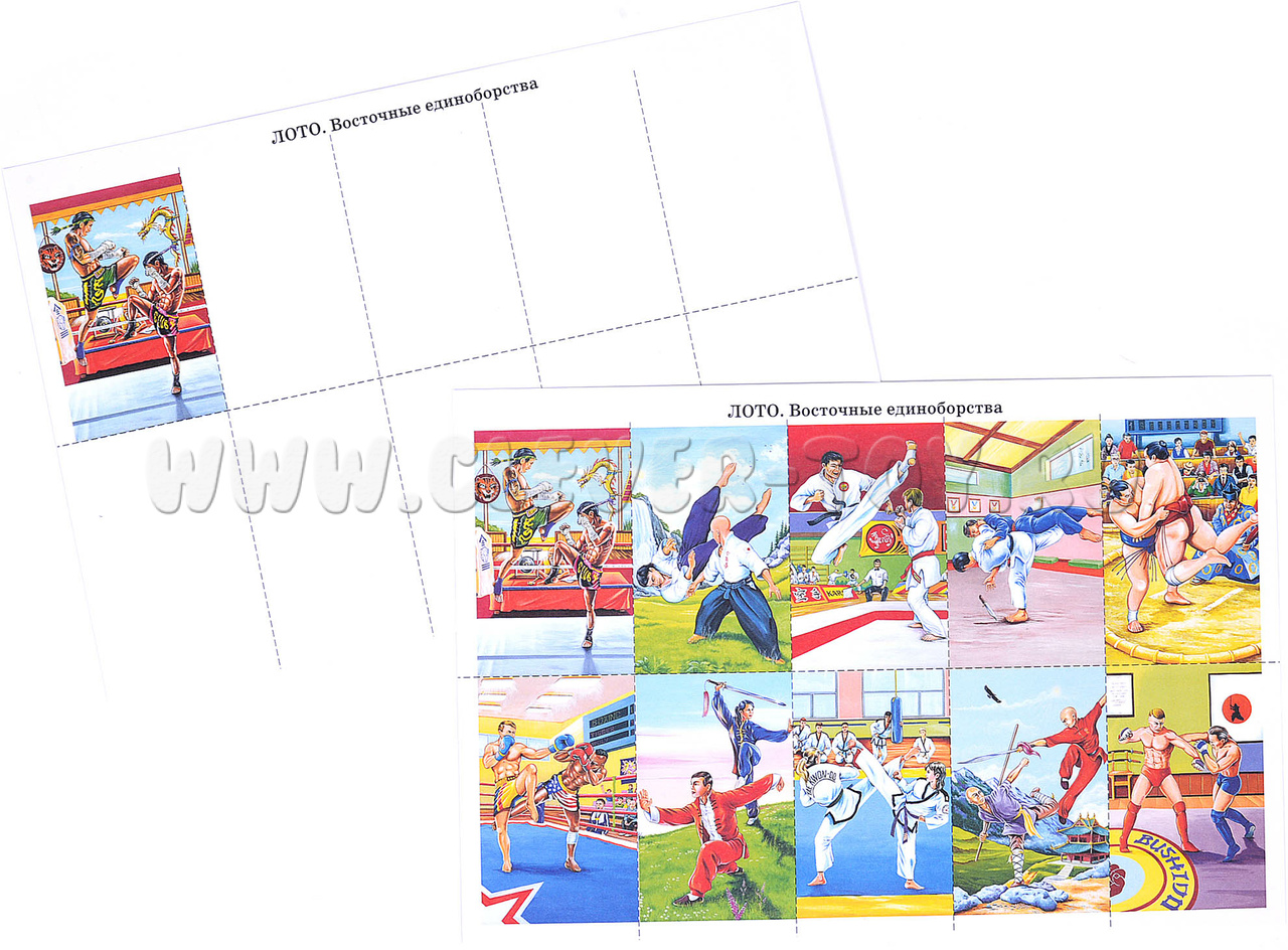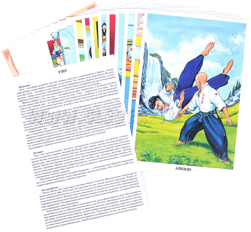 • 10 иллюстраций различных видов восточных единоборств, на обороте - описание, краткая историческая справка, несколько интересных тематических фактов;