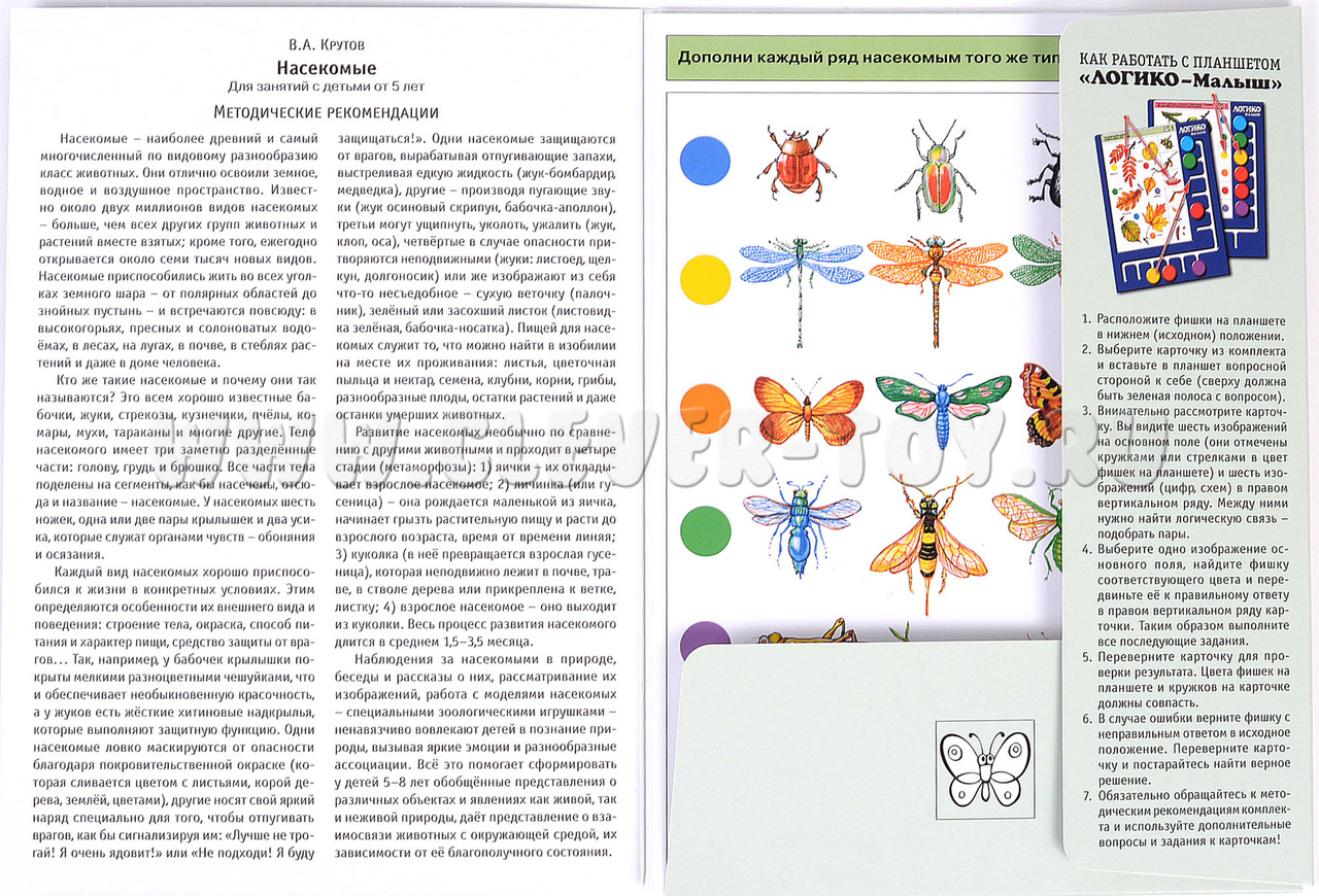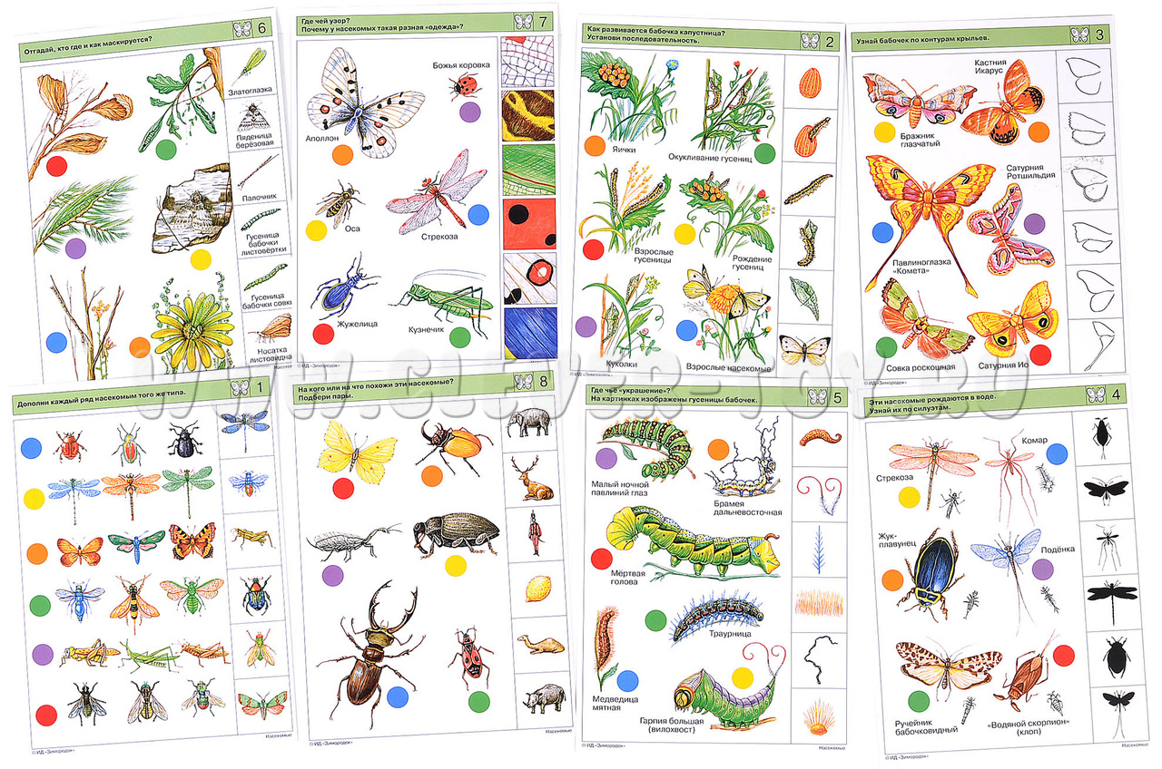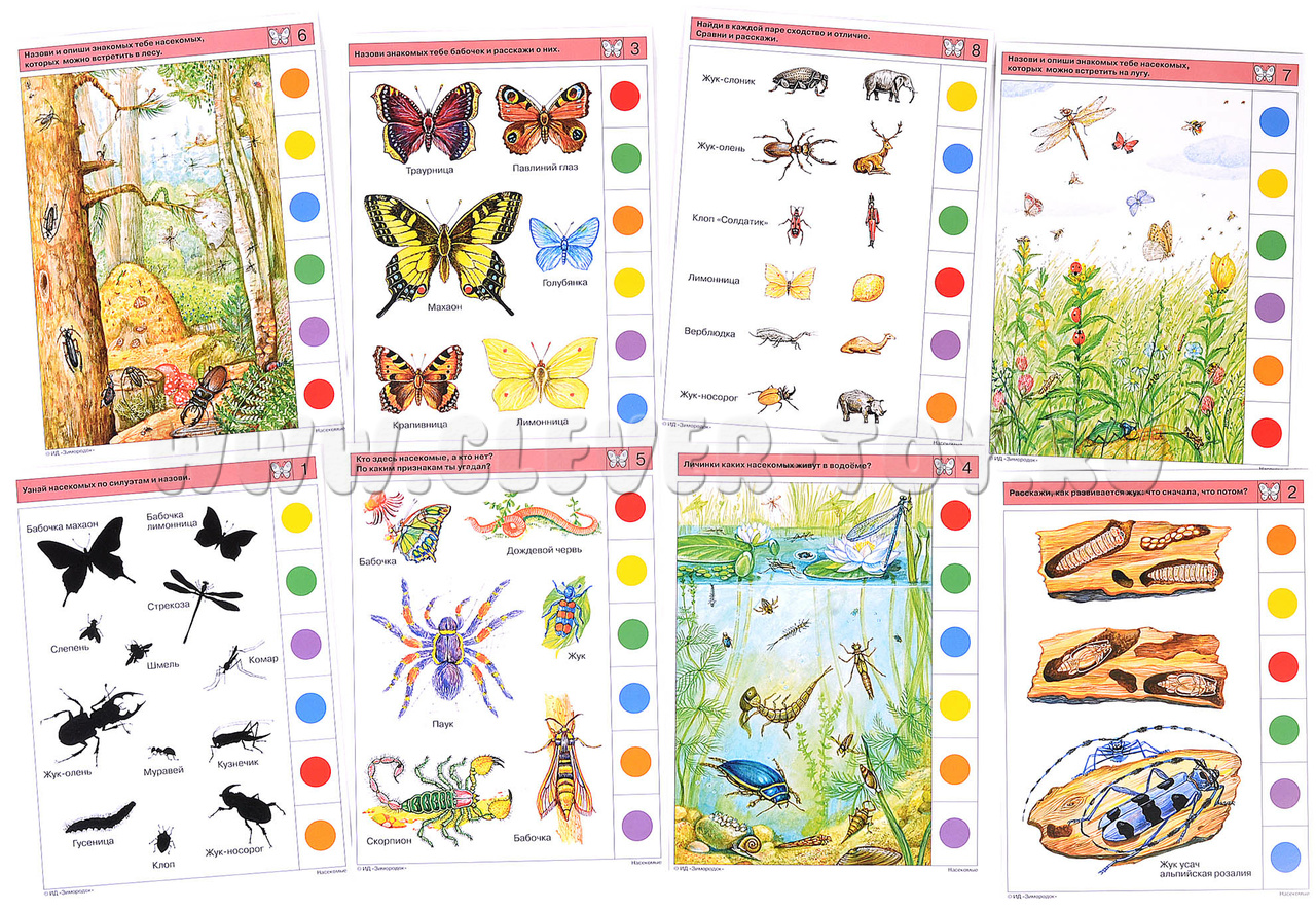 Комплект карточек знакомит ребёнка с наиболее древним и самым многочисленным по видовому разнообразию классом животных. Это всем хорошо известные бабочки, жуки, стрекозы, кузнечики, пчёлы, комары, мухи, тараканы и многие другие. Решая задания, ребёнок будет не только узнавать новых и называть уже хорошо известных ему насекомых, но и выстраивать этапы их развития, сортировать по видам. Примеры заданий в карточках: 1б. Узнай насекомых по силуэтам и назови. 2б. Расскажи, как развивается жук: что сначала, что потом? За. Узнай бабочек по контурам крыльев. 5б. Кто здесь насекомые, а кто нет? По каким признакам ты угадал? 6а. Отгадай, кто, где и как маскируется?