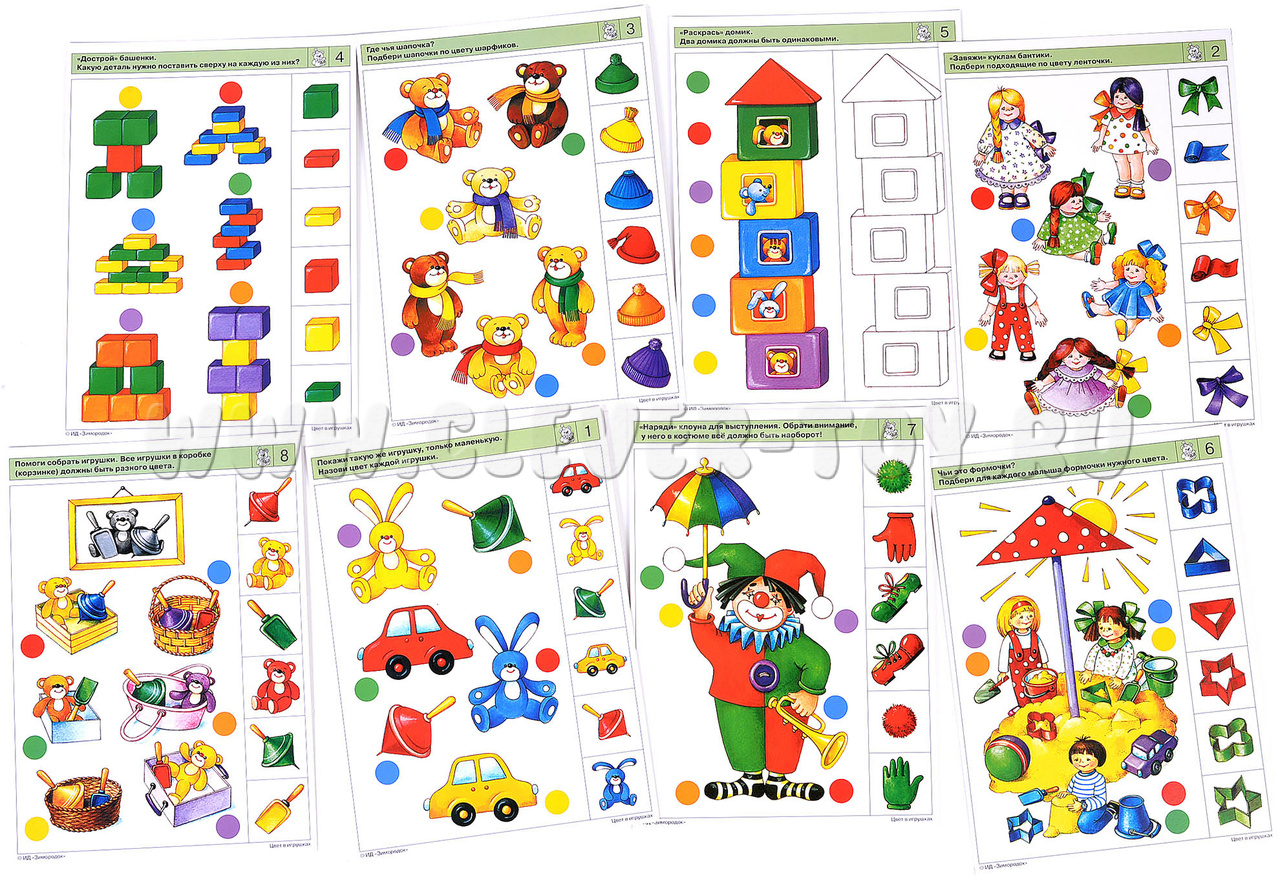 Первое знакомство ребёнка с цветом. Задания комплекта научат малыша узнавать, различать и называть цвета, выбирать целое изображение заданного цвета или его части (цвет мишки и отдельно цвет шапочки на нем), сравнивать изображения по цвету между собой и группировать их по этому важнейшему признаку. Примеры заданий в карточках: 1а. Покажи такую же игрушку, только маленькую. Назови цвет каждой игрушки. 2а. «Завяжи» куклам бантики. Подбери подходящие по цвету ленточки. 3б. Из ниток какого цвета сделан узор на одежде каждого медвежонка 4б. «Поставь» каждую машинку в гараж. 8а. Помоги собрать игрушки. Все игрушки в коробке должны быть разного цвета.