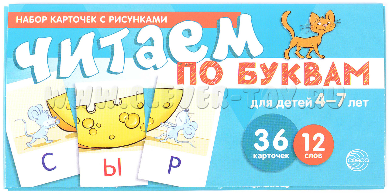 Издание, предназначенное для обучения детей 4-7 лет чтению, представляет собой комплект из 12 обучающих картинок, включающих 36 карточек и 12 слов.