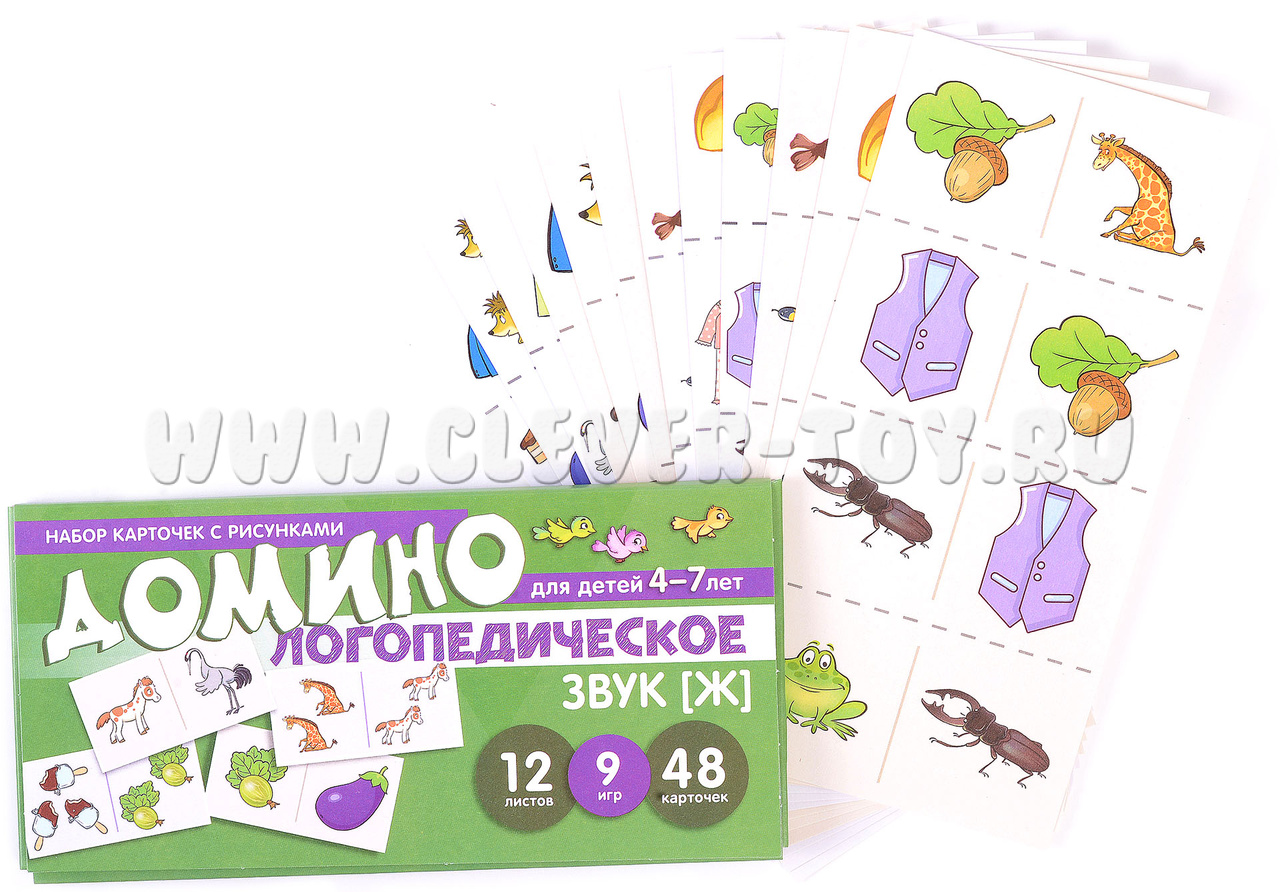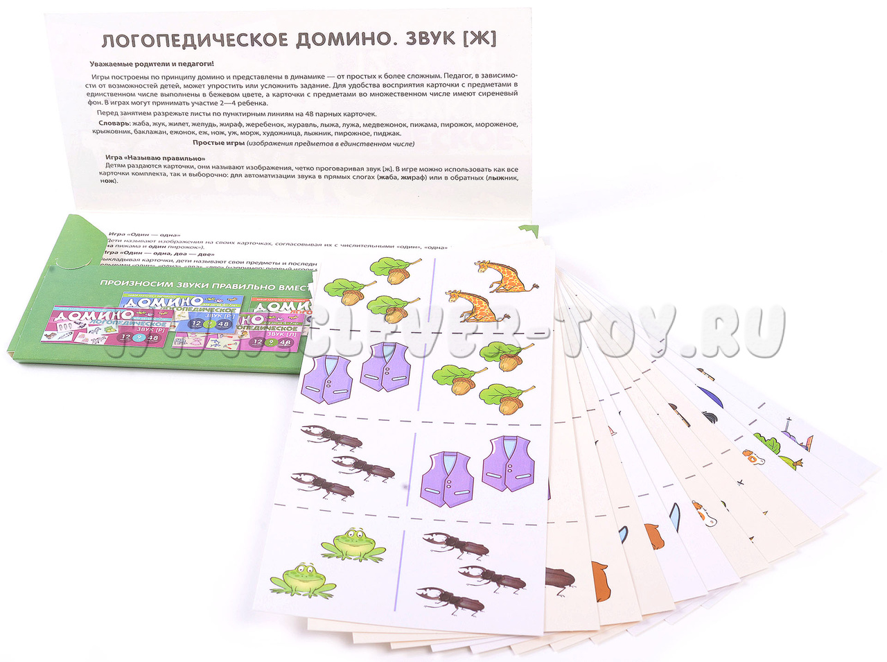 "Логопедическое домино" - это учебно-игровой комплект, который состоит из 12 обучающих карточек с 48 парными цветными картинками. С помощью этого набора ребёнок сможет в игровой форме научиться правильно произносить звук [Ж], образовывать форму множественного числа существительных и согласовывать их с числительными и прилагательными.
