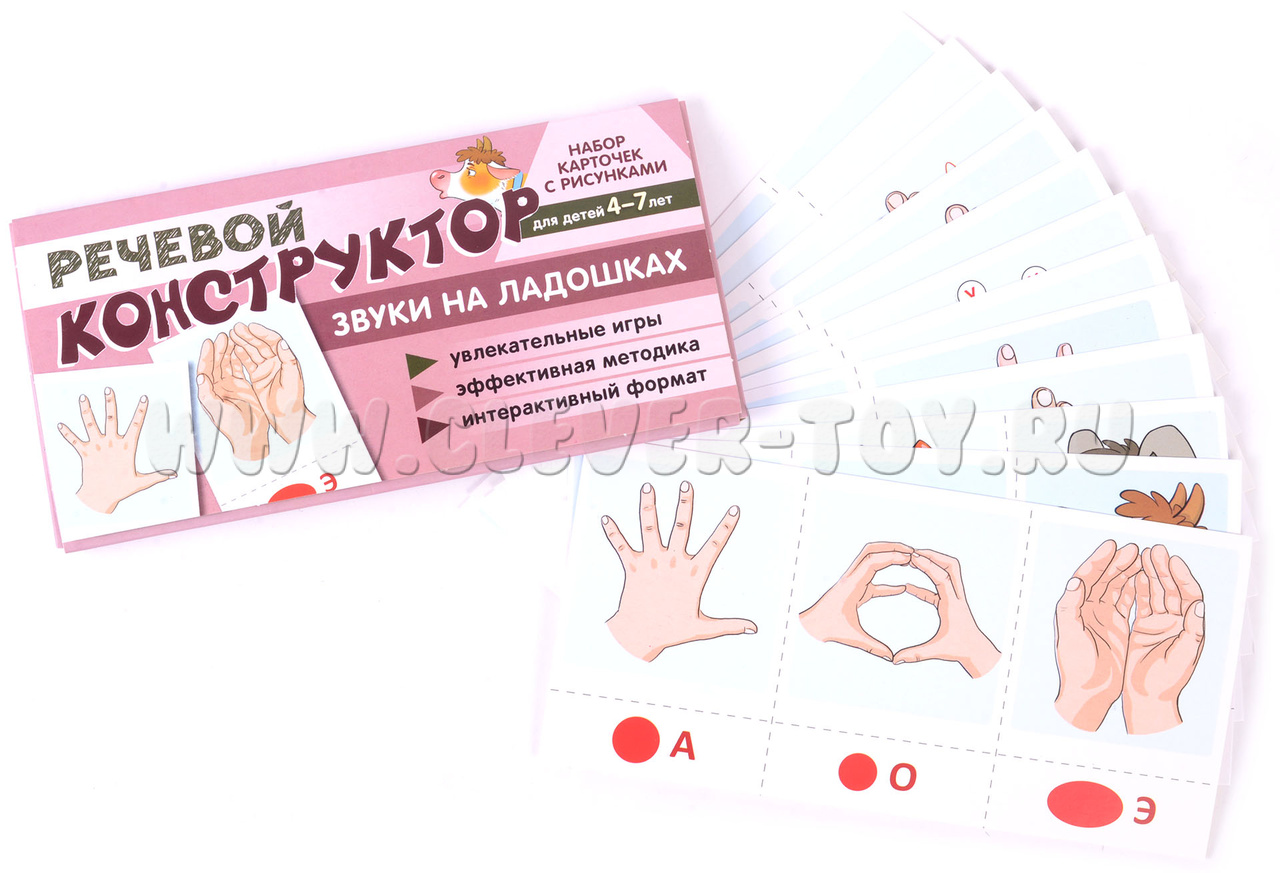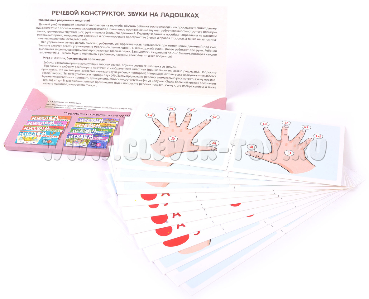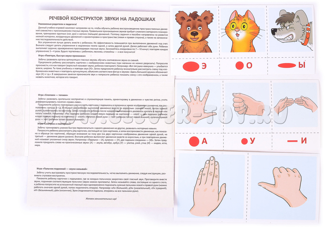 Комплект "Речевой конструктор: Звуки на ладошках" представляет собой 12 листов, состоящих из 44 карточек и 4 игр. Ребенок научится совершать пространственные действия, произнося одновременно гласные звуки, а также воспроизводить цепочки движений, развивая моторные навыки, зрительное восприятие и слухомоторную память.