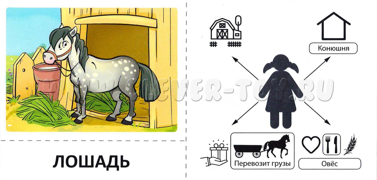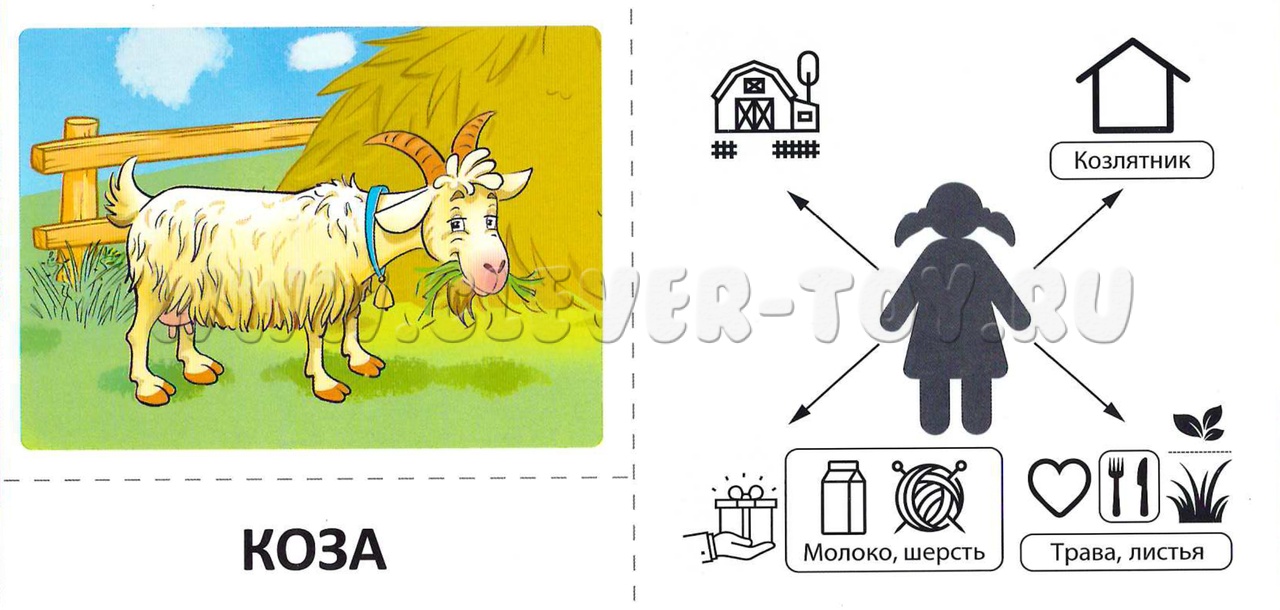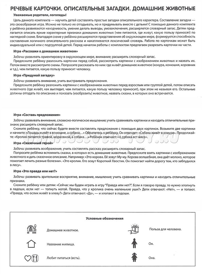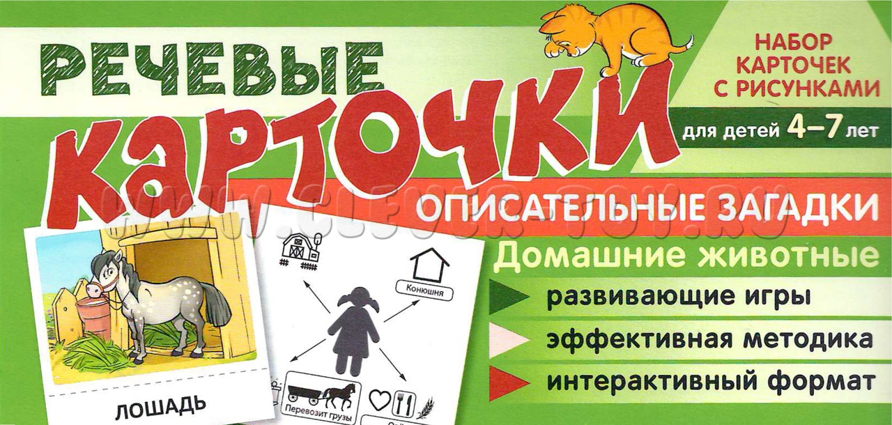 Для детей в возрасте от четырёх до семи лет создан комплект Речевые карточки. Описательные загадки. Домашние животные». В него входят 12 страниц, на которых размещены 35 карточек и четыре игры. С помощью этого комплекта ребёнок сможет в увлекательной форме научиться определять по наглядной схеме особенности предметов (цвет, форма, размер), составлять простые загадки, в которых нужно описать предмет, делать выводы и умозаключения. Также комплект поможет расширить словарный запас ребёнка.