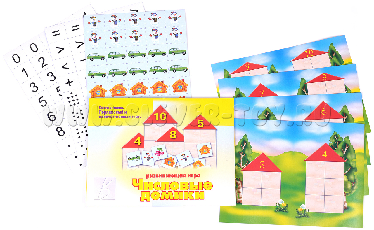 Игра "Числовые домики" поможет малышам старше 3-х лет познакомиться с основами арифметики, составом числа, обучиться порядковому и количественному устному счёту и начать решать простые примеры на сложение и вычитание.