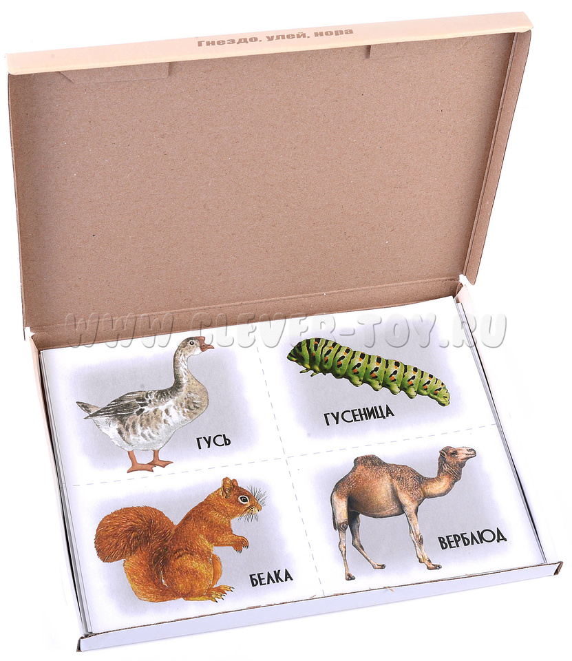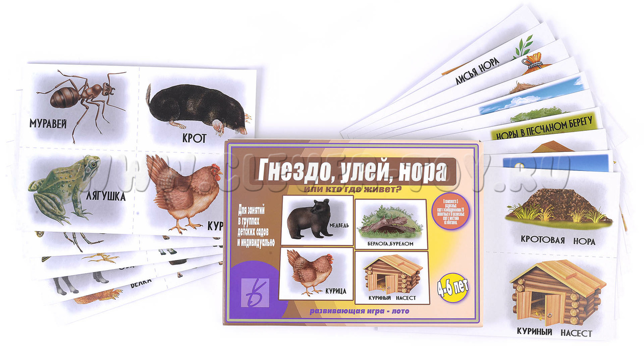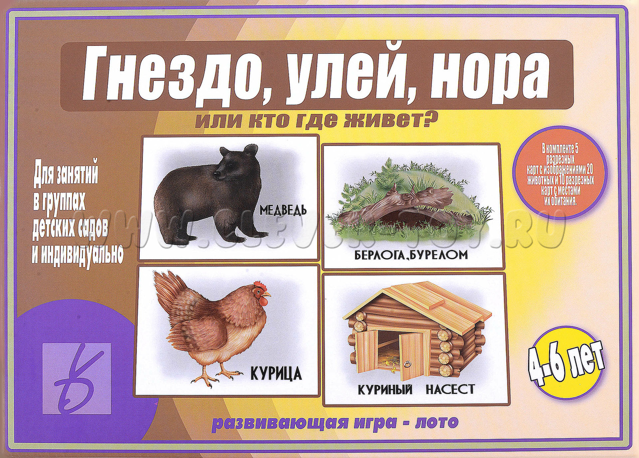 Ребенок раскладывает карточки с животными на изображения жилищ, в которых они обитают. Расскажите ему, где медведь проводит зиму, где курица высиживает яйца и т.п. Поведайте все, что Вы знаете о каждом животном, а потом предложите ребенку самому рассказать о жизни и повадках героев игры.