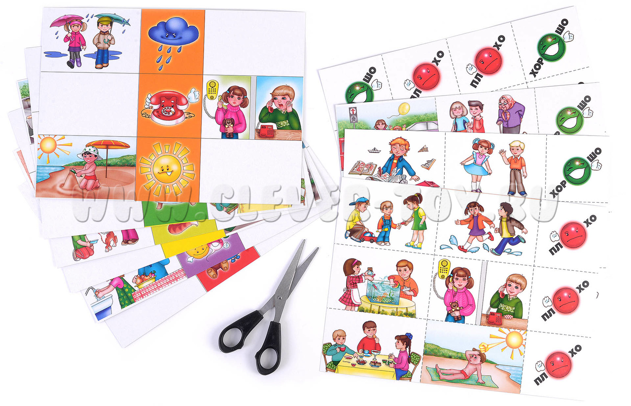 1 игра. Перед началом игры поговорите с ребёнком о том, что означают понятия «хорошо» или «плохо». Малыши должны дать развёрнутый ответ. Возьмите большие карты, где в центральном столбике изображены темы, предметы ситуаций, а слева и справа — варианты поведения детей. Ребята должны отследить каждую ситуацию по горизонтали, рассказать, что они наблюдают, и выложить на пустое место свою фишку-оценку поведения детей на картинке. Малыши должны обязательно объяснить свой выбор.