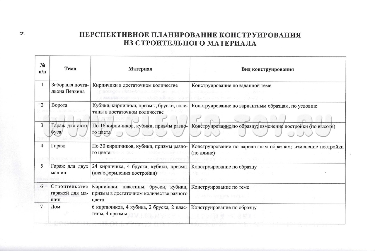 Материал подобран по темам, предусмотрены организация разных видов конструирования (по образцу, вариантным образцам, незаконченному образцу, по условию, по заданной теме, по замыслу), формирование умений и возможные усложнения заданий.